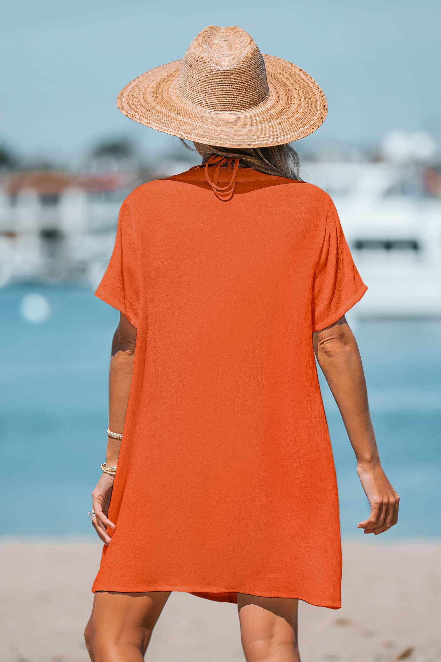 Cette robe mini de plage orange est parfaite pour les journées chaudes au bord de l’eau. Son encolure échancrée, ses manches courtes, sa longueur mini et sa matière légère offrent un look aérien et facile à enfiler.