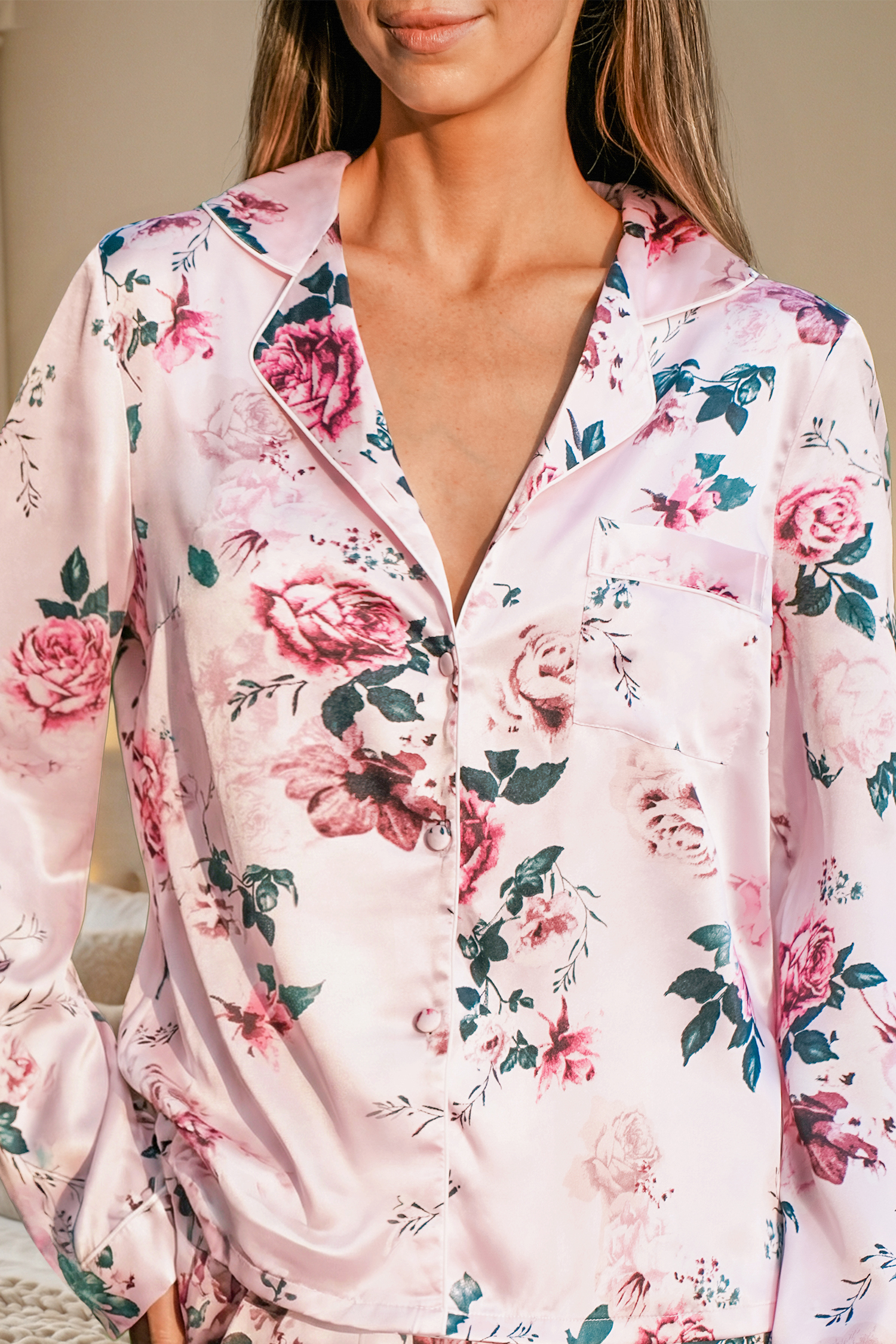 Ce pyjama fleuri apporte une énergie douce et féminine à vos soirées cocooning. Son col à revers, ses manches longues et son pantalon assorti le rendent parfait pour des nuits confortables.