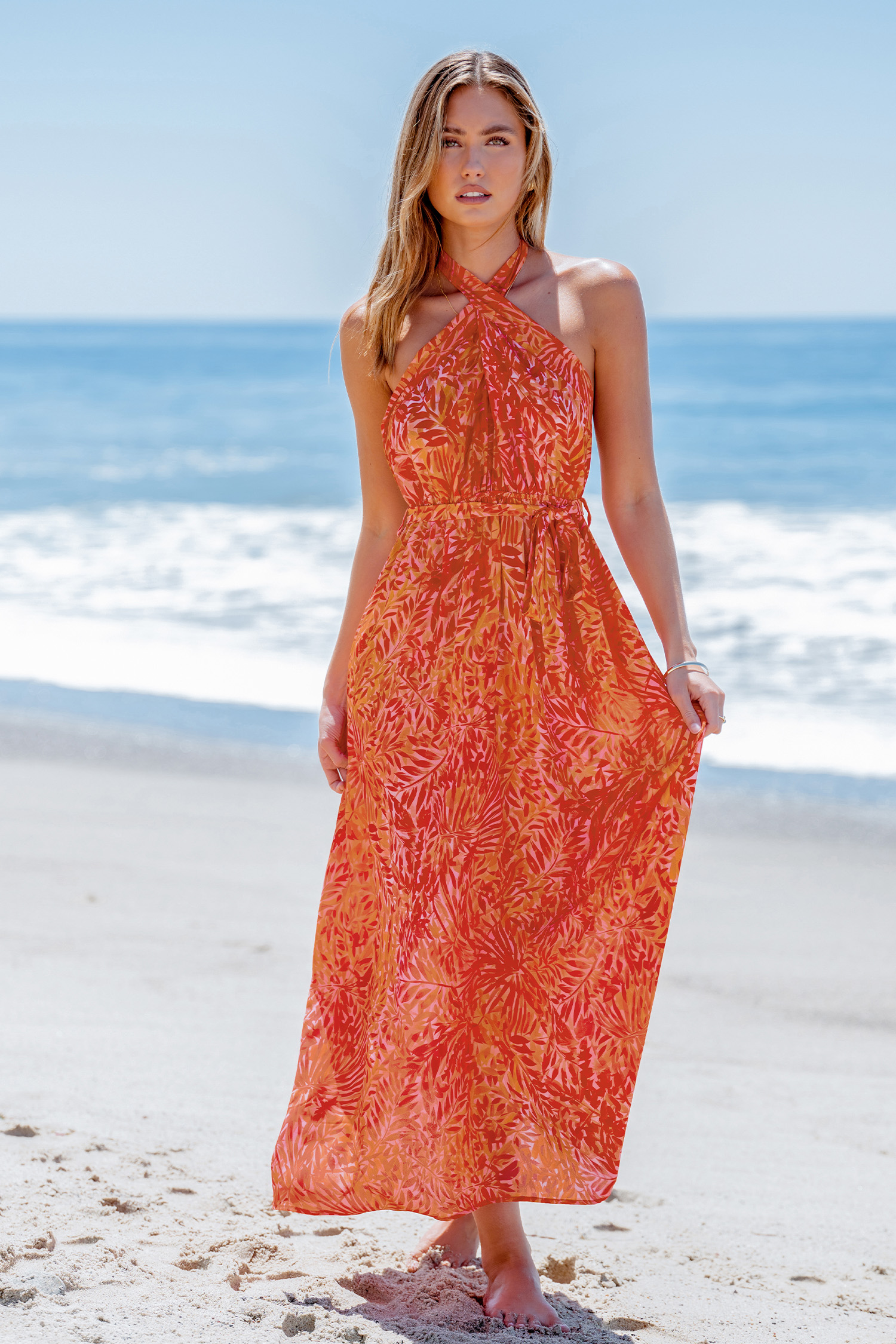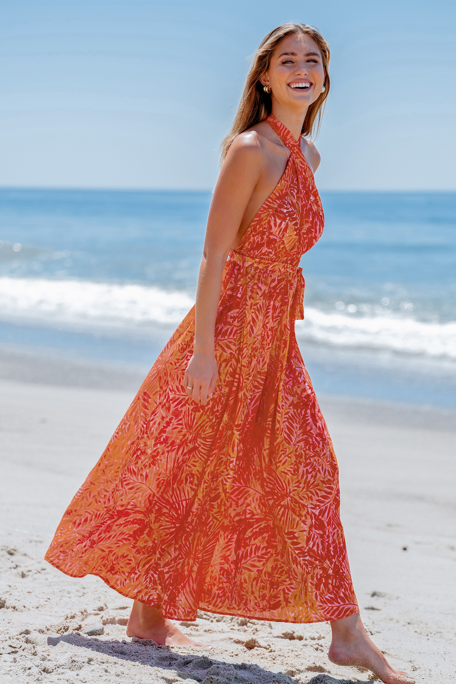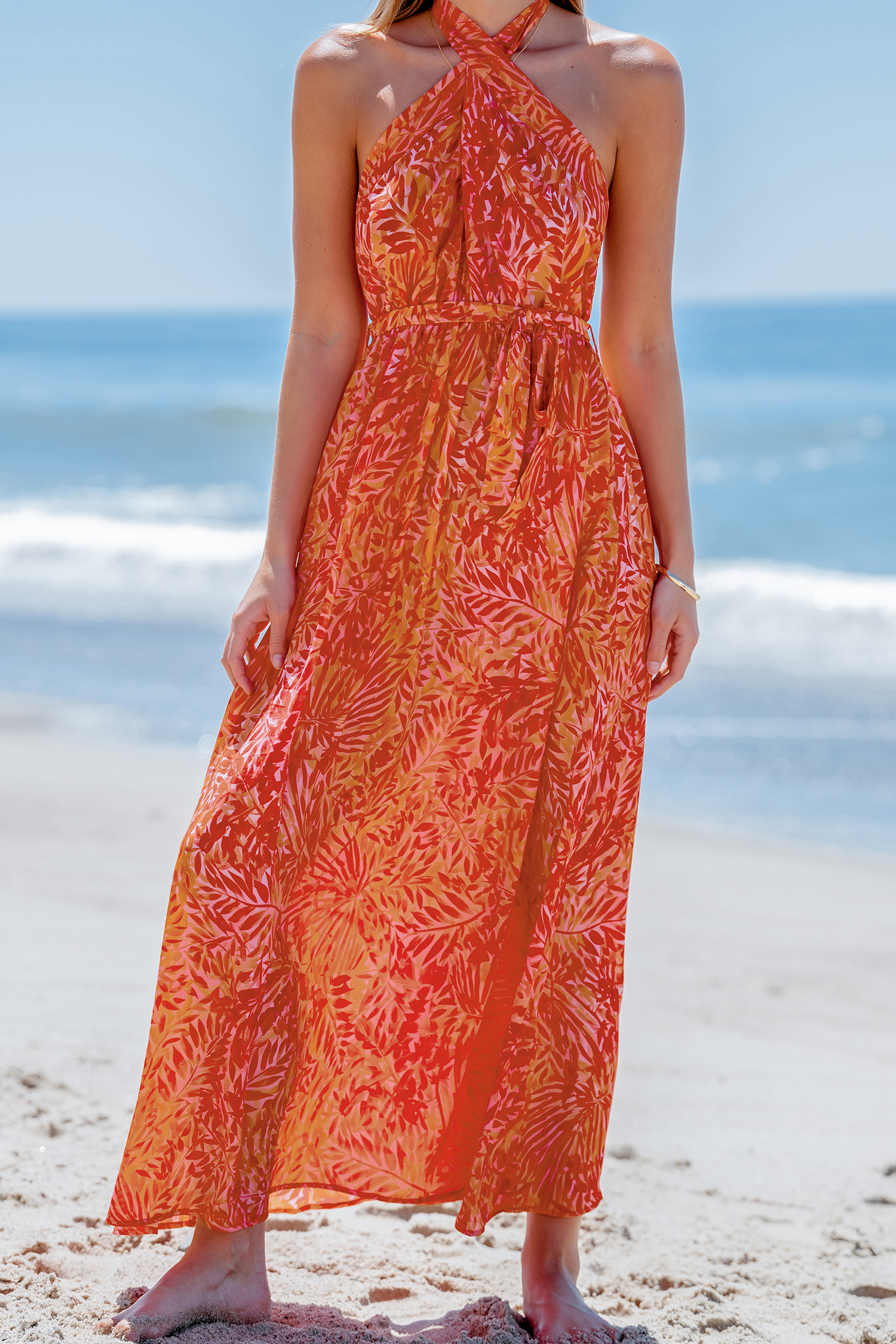 Robe maxi découpée avec ceinture à imprimé feuilles