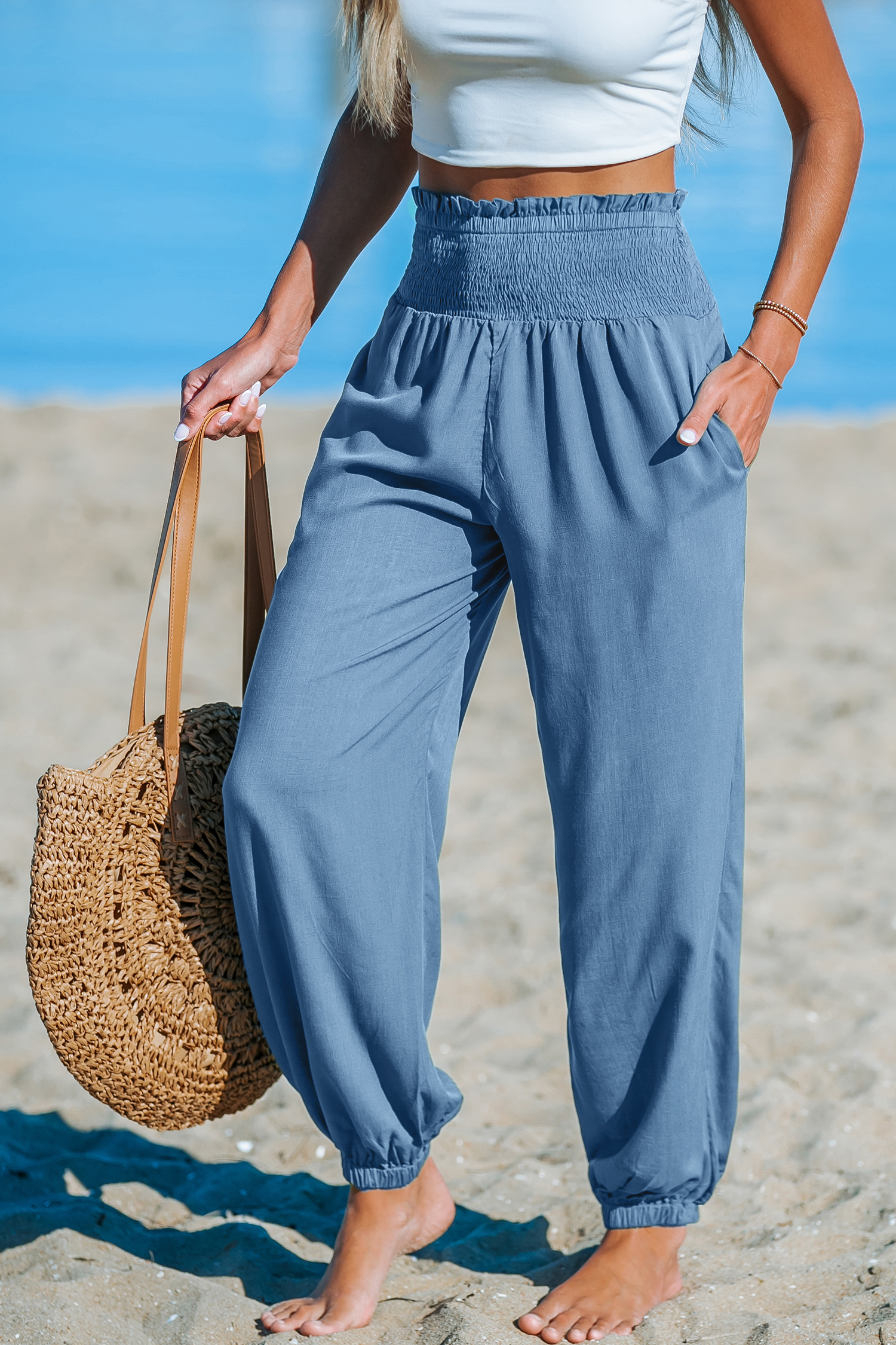 Ce pantalon bleu offre une allure décontractée et prête pour la plage. Sa taille smockée et sa jambe fuselée assurent un porté confortable tout en restant soigné.
