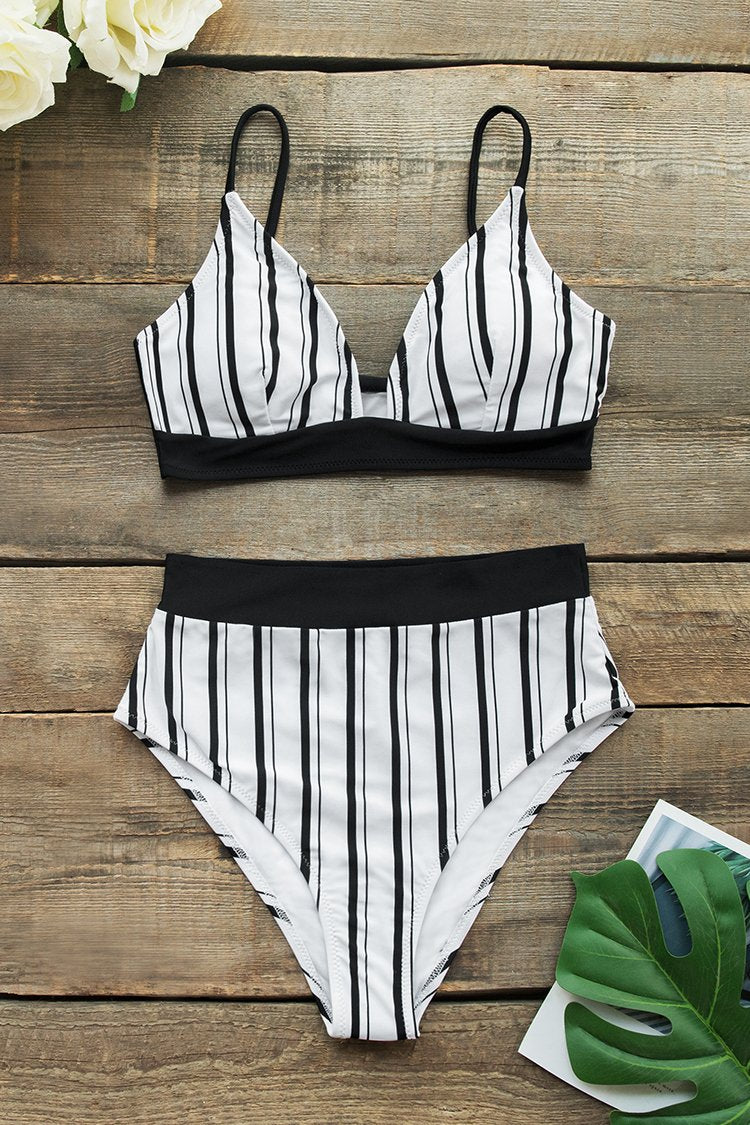 Bikini taille haute à rayures verticales noir et blanc