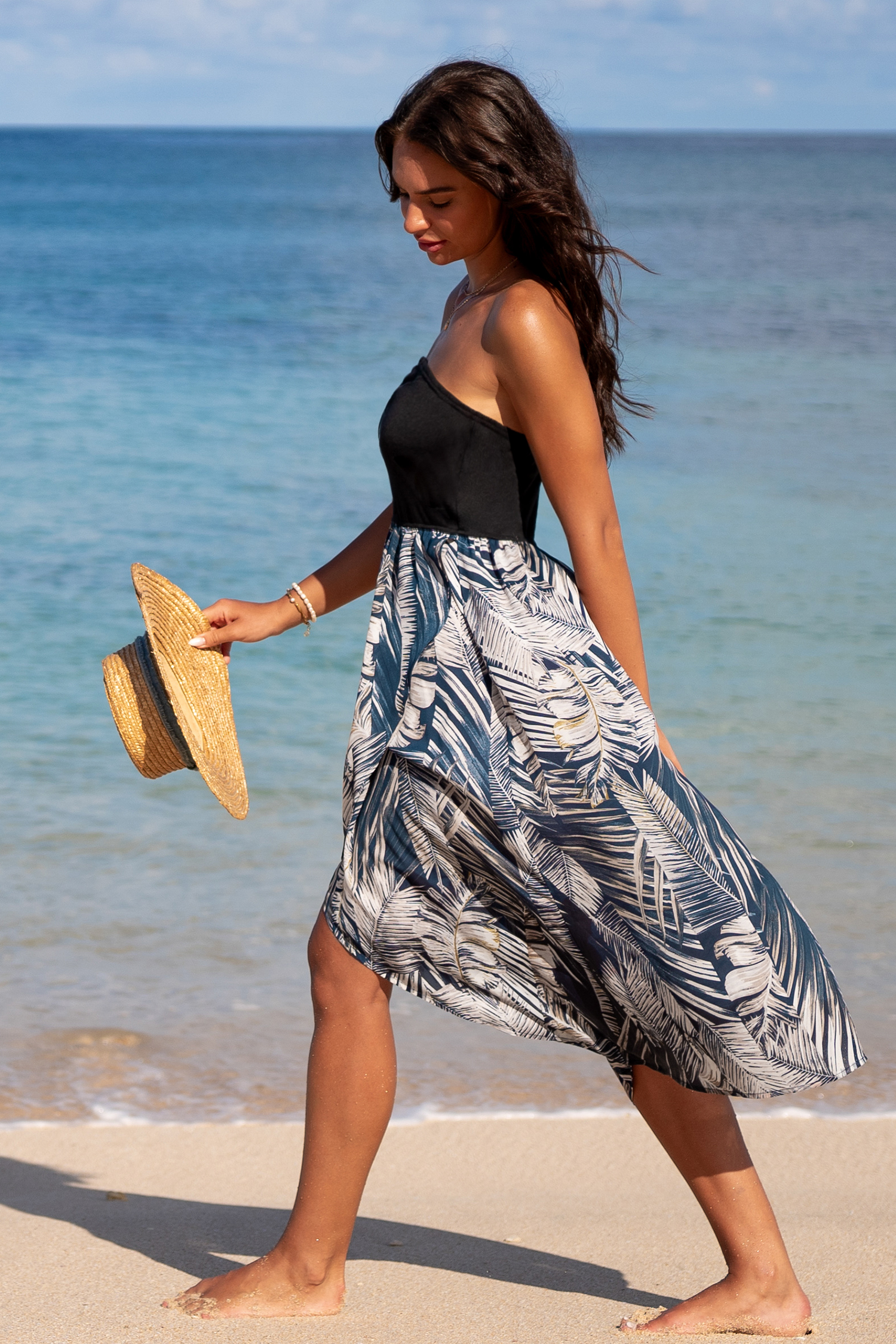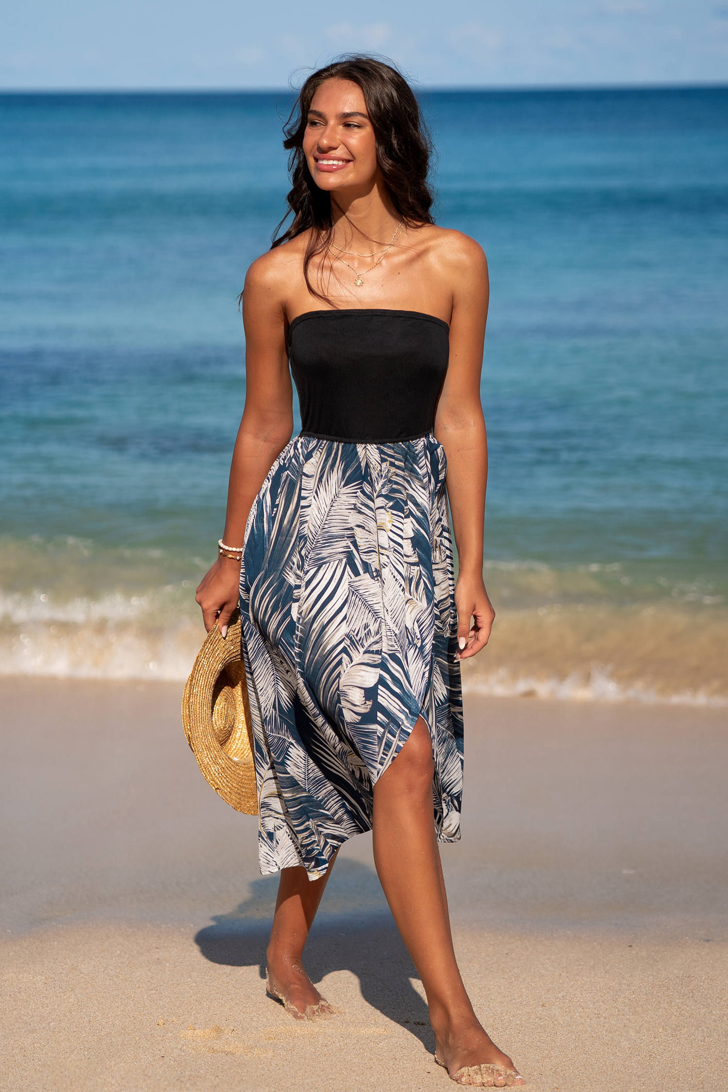 Robe tube midi à imprimé feuilles tropicales bleu marine