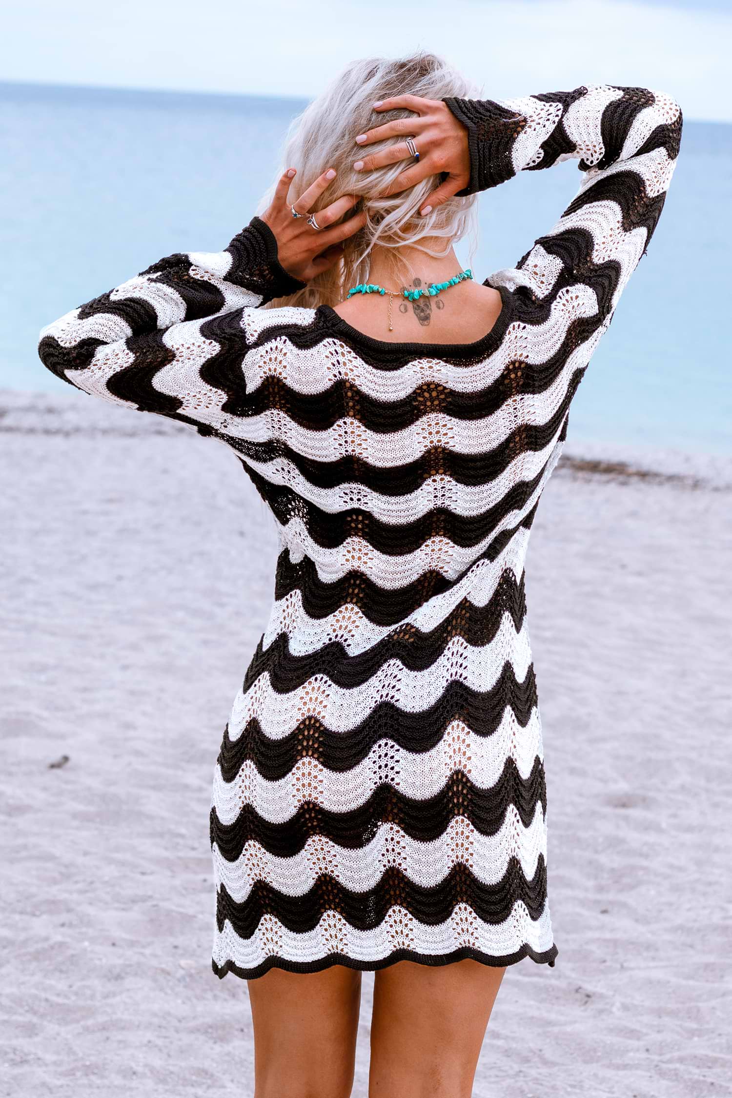 Cover up avec manches longues en crochet noir et blanc