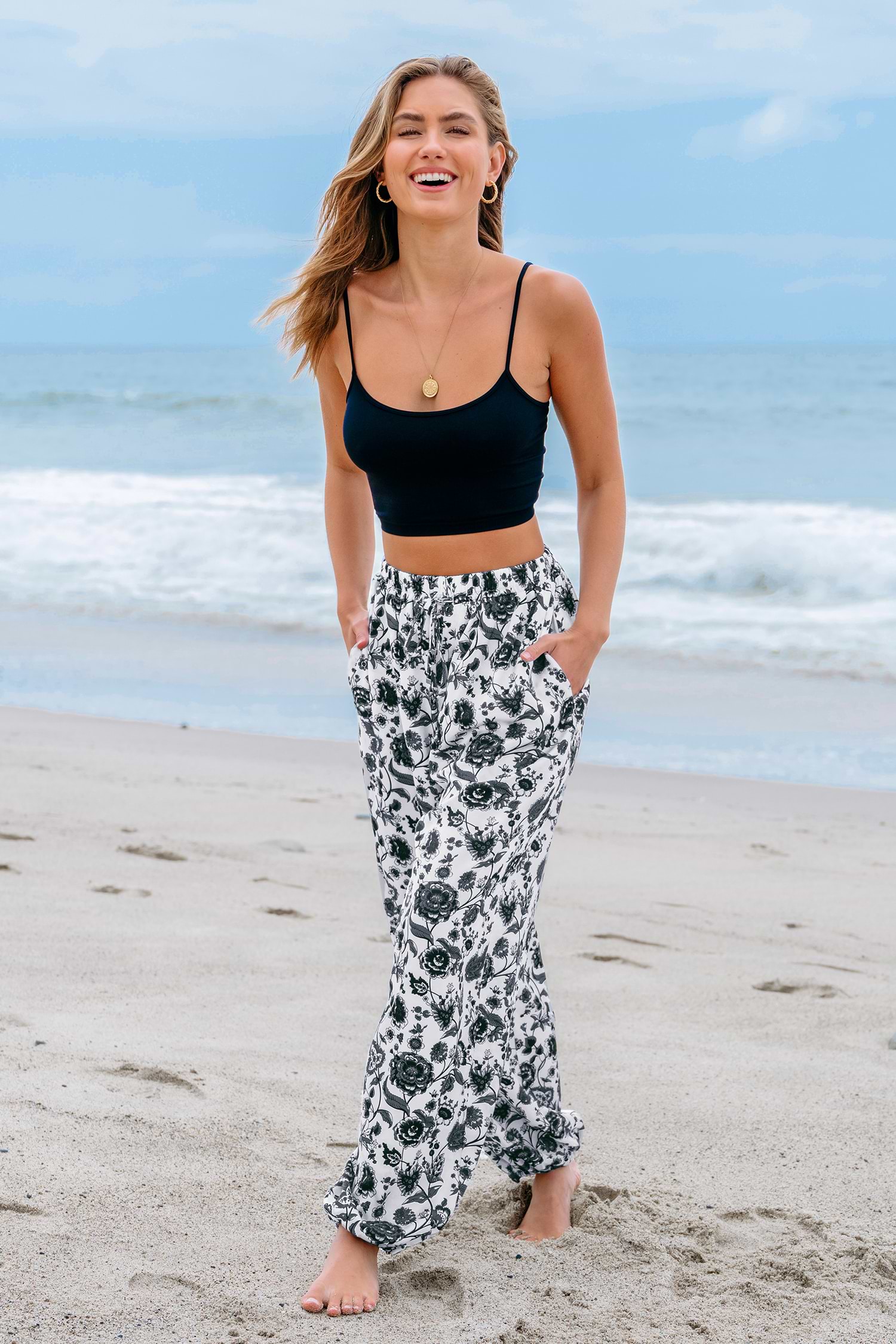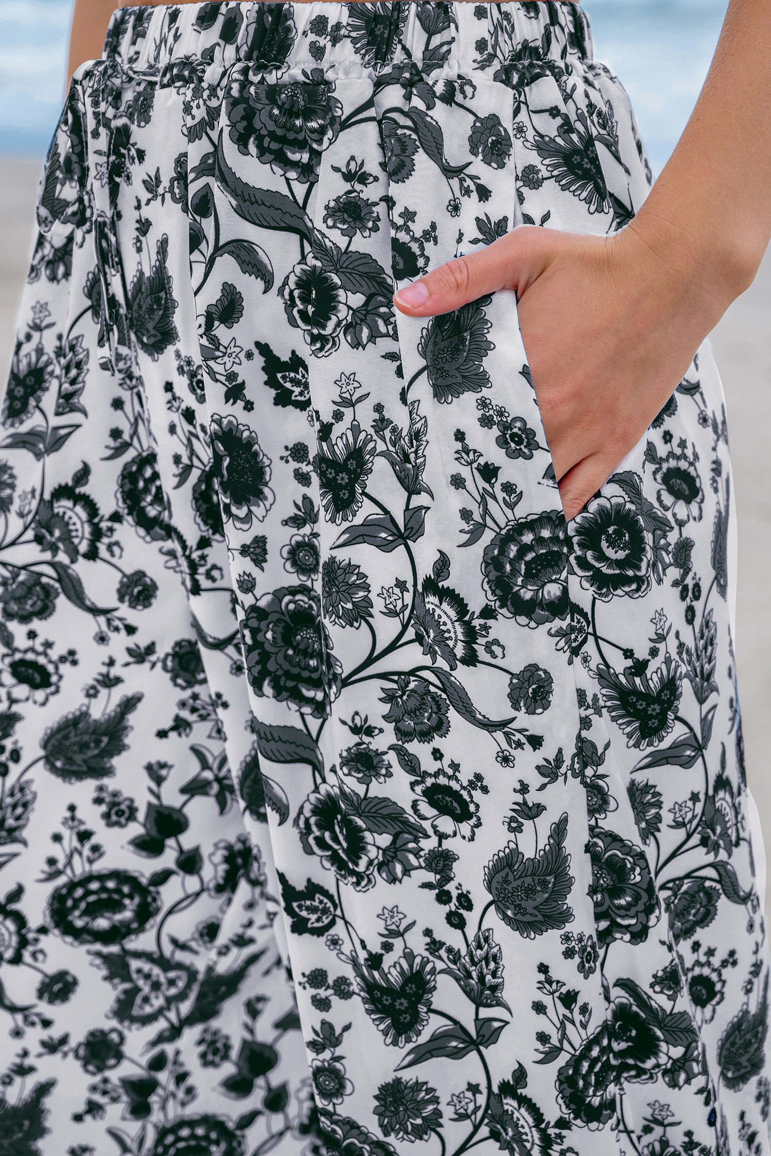 Pantalon à jambes trapèze et taille élastique à fleurs noires