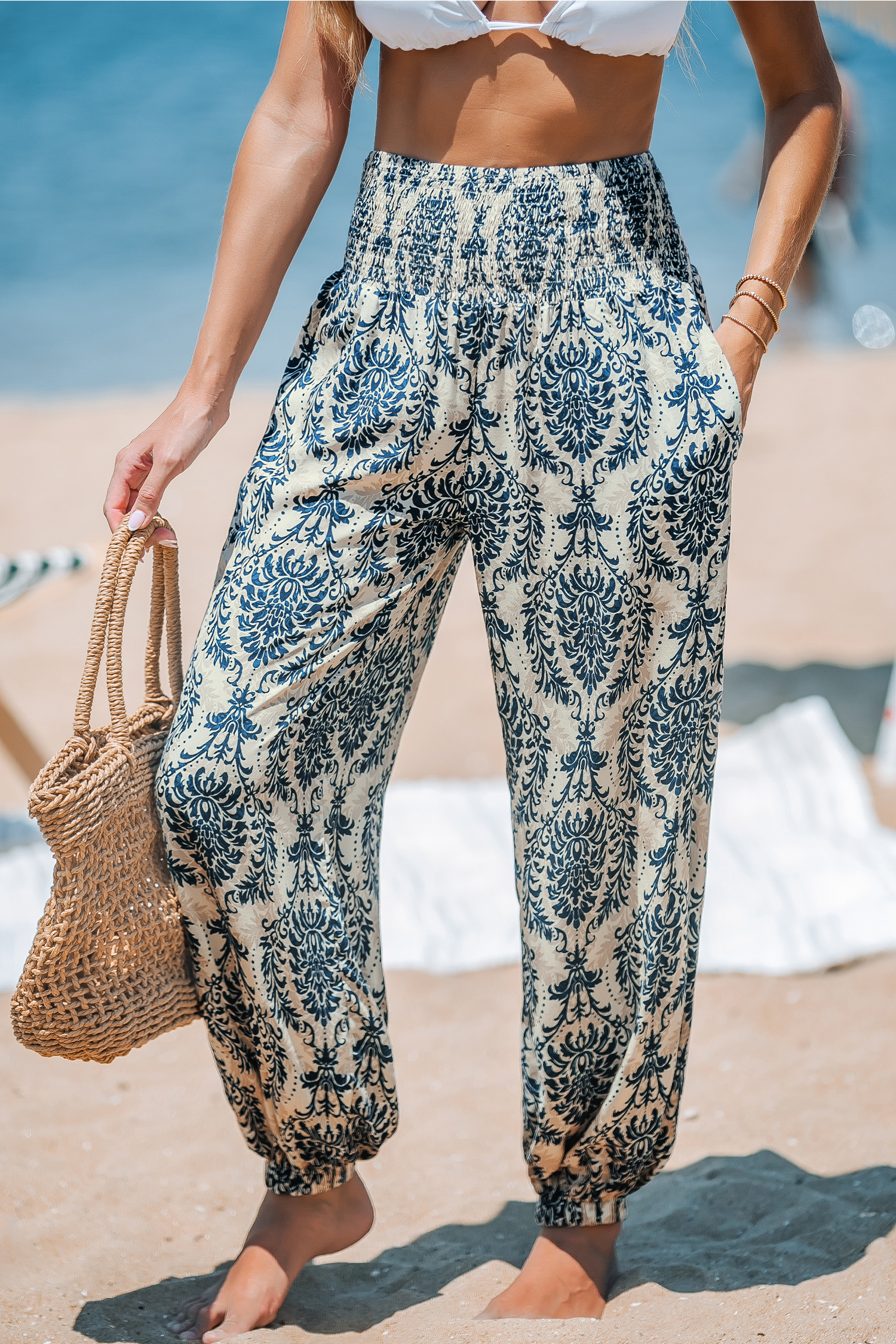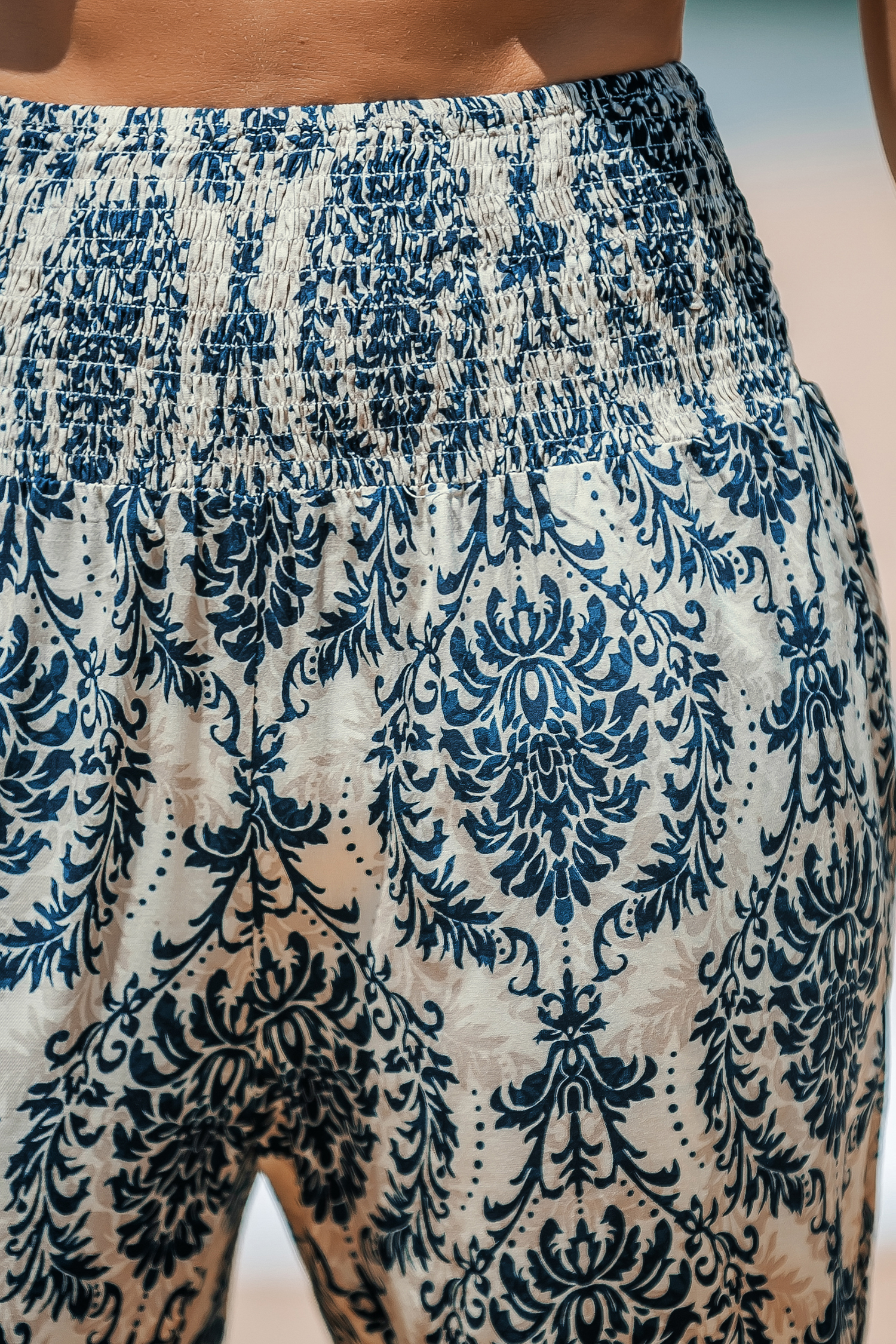 HomePantalon à taille à smocks et jambe trapèze bleu