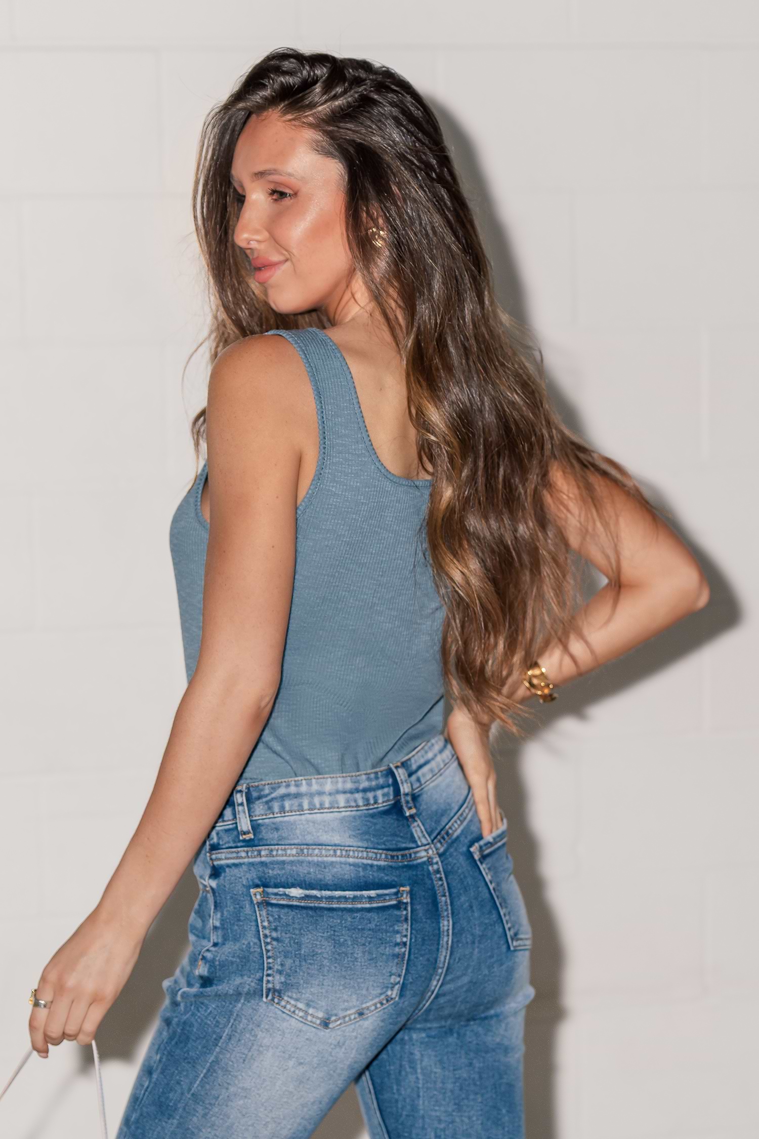 Débardeur à col carré en tricot côtelé bleu