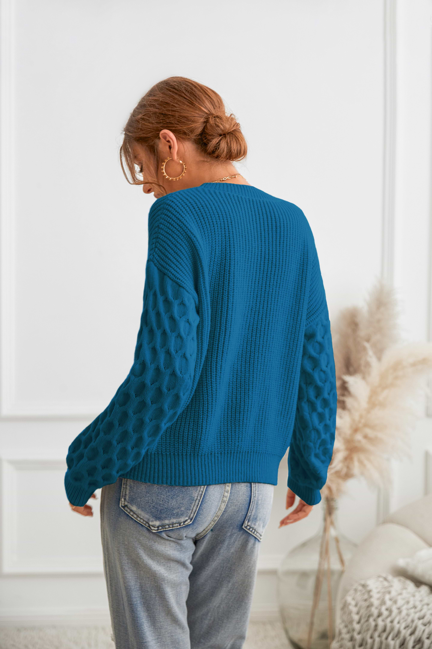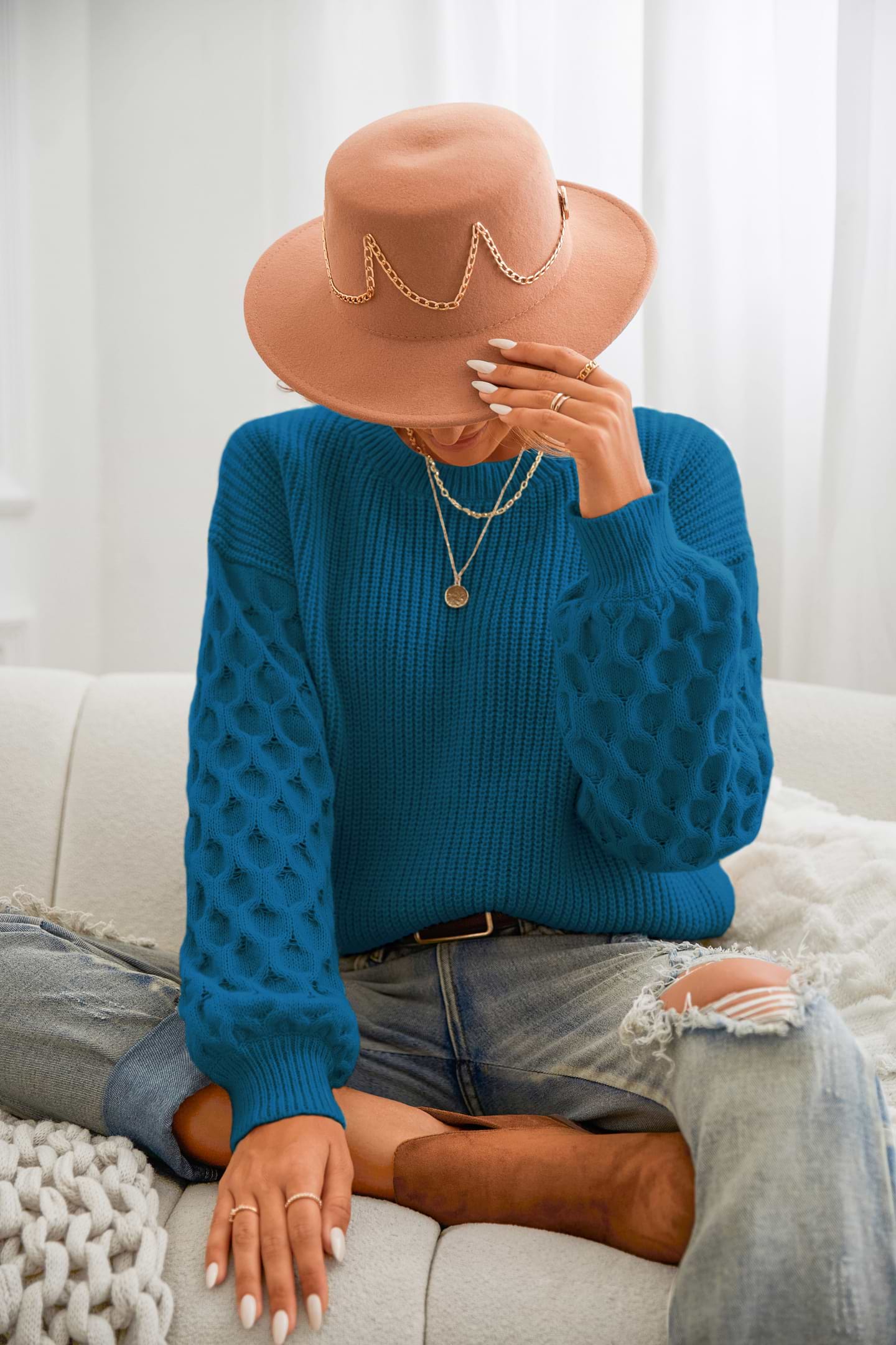 Pull bleu à col rond et à manches bouffantes en nid d'abeille