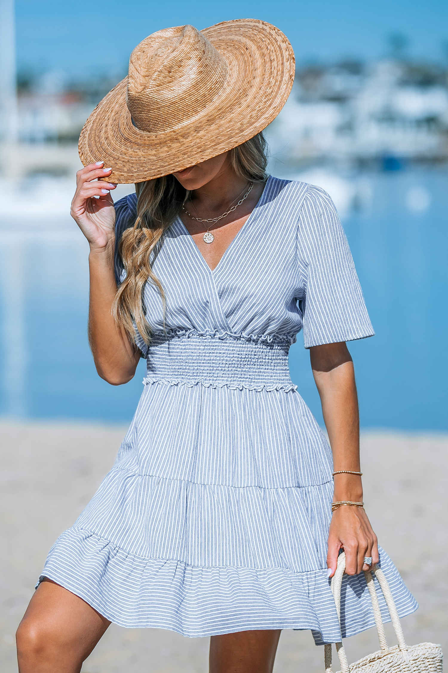 Robe mini en pur coton avec ourlet à volants et rayures bleue