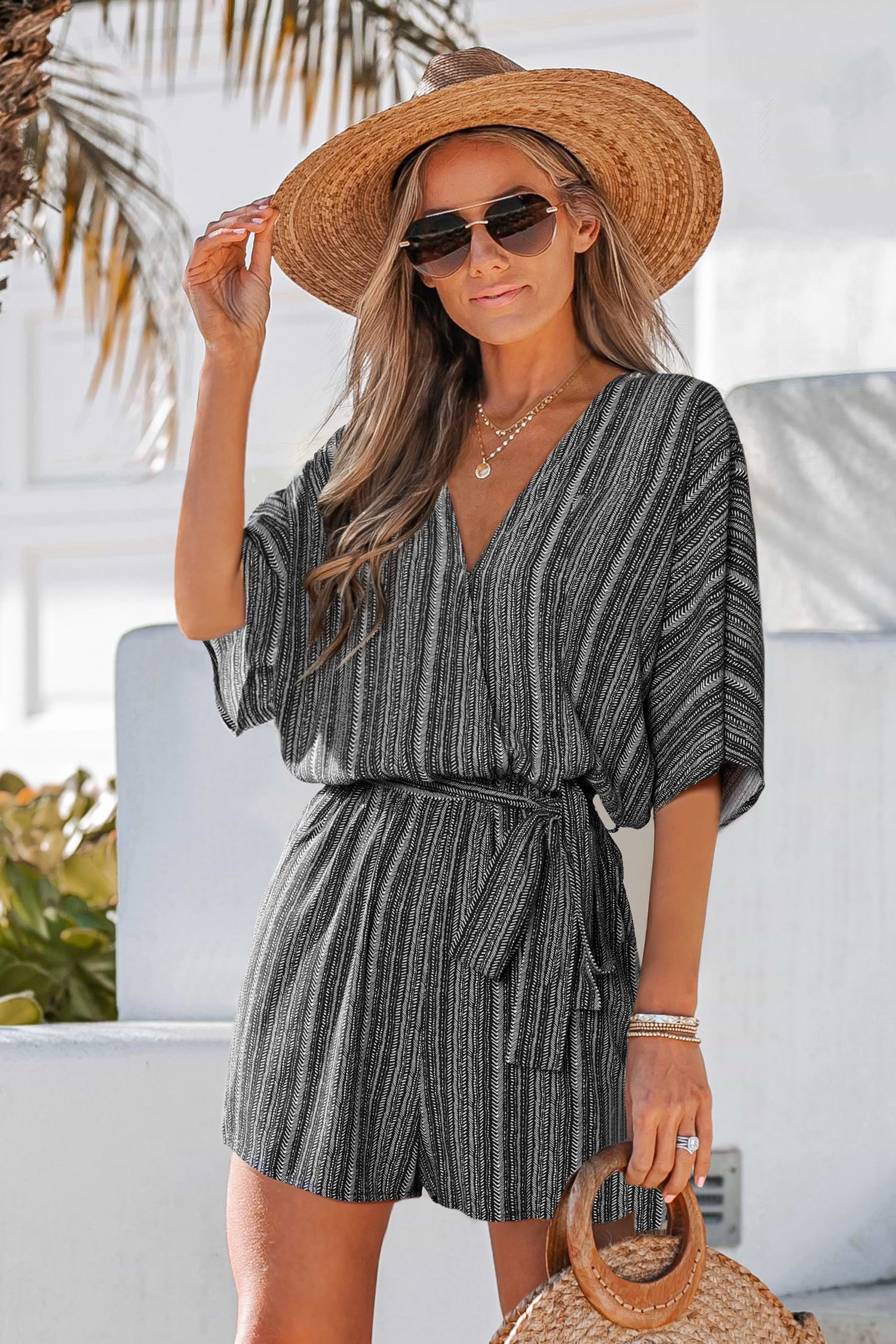 Ce combishort rayé au style bohème est votre allié pour un look facile et tendance. Décolleté croisé, manches mi-longues et taille ceinturée : le tout complété par une jambe ample pour une silhouette fluide et détendue.