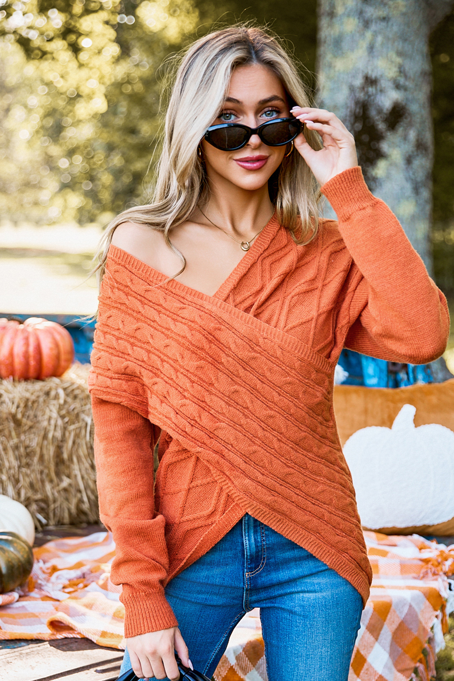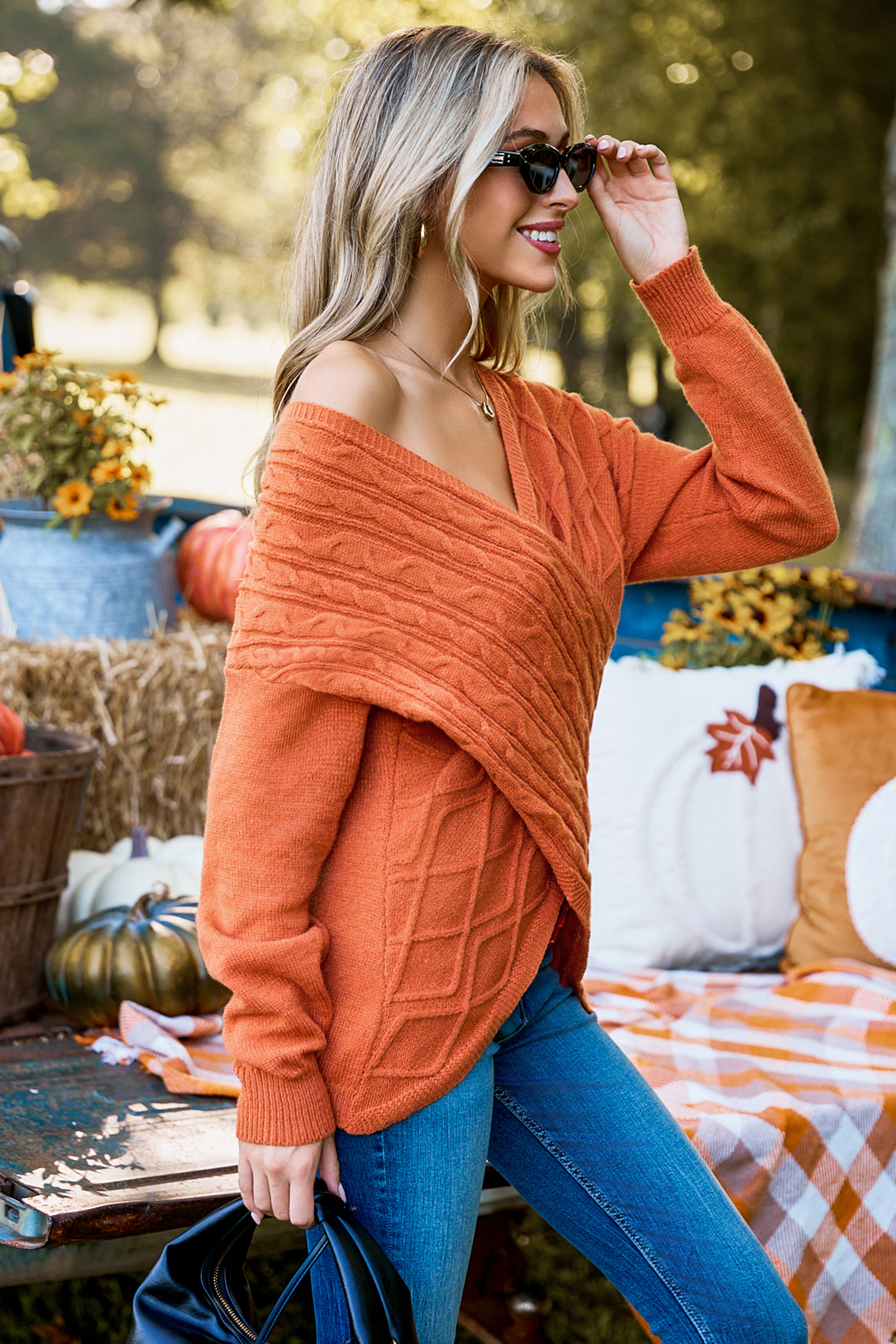 Pull à col asymétrique épaules dénudées en tricot torsadé