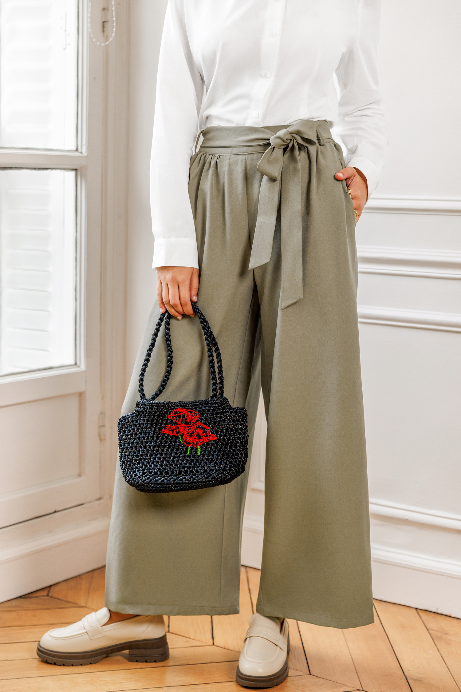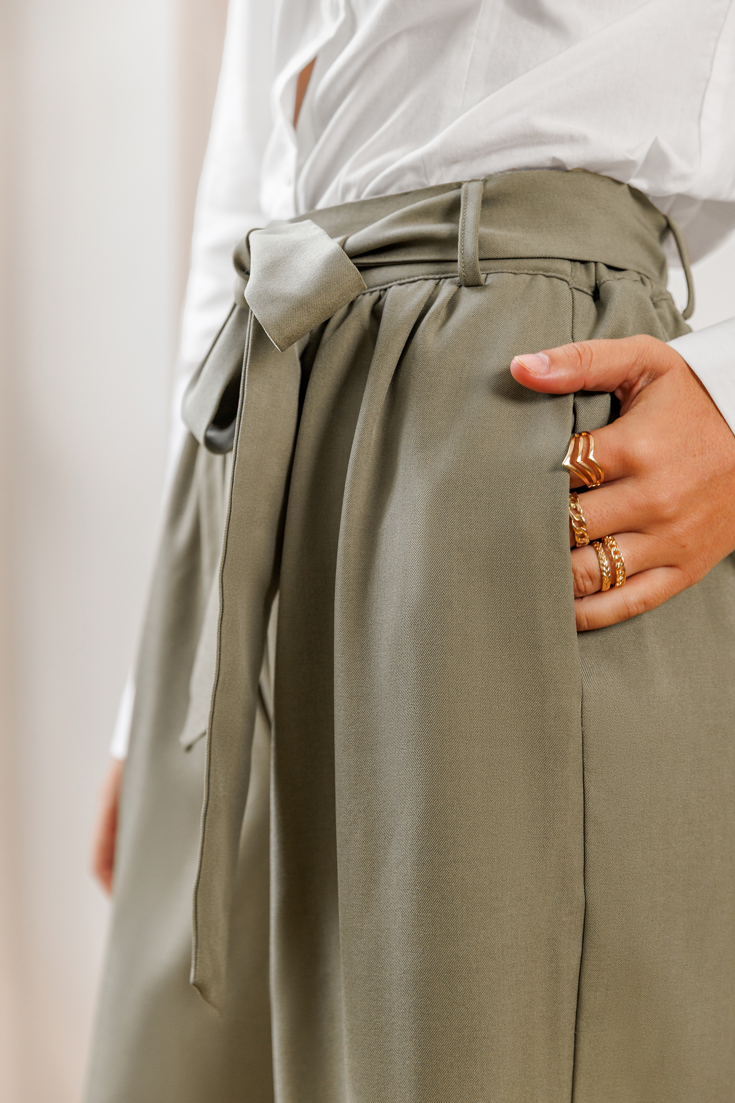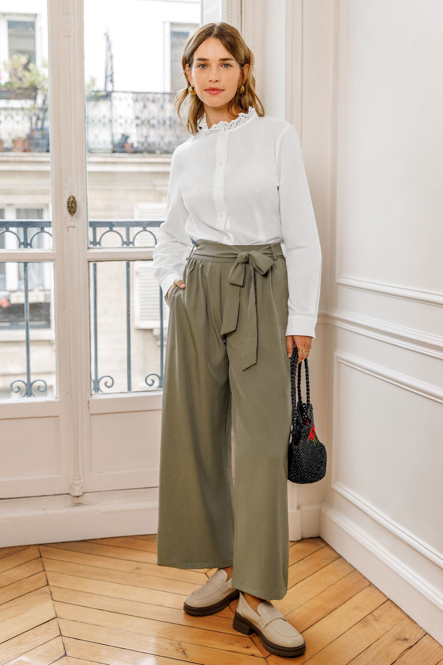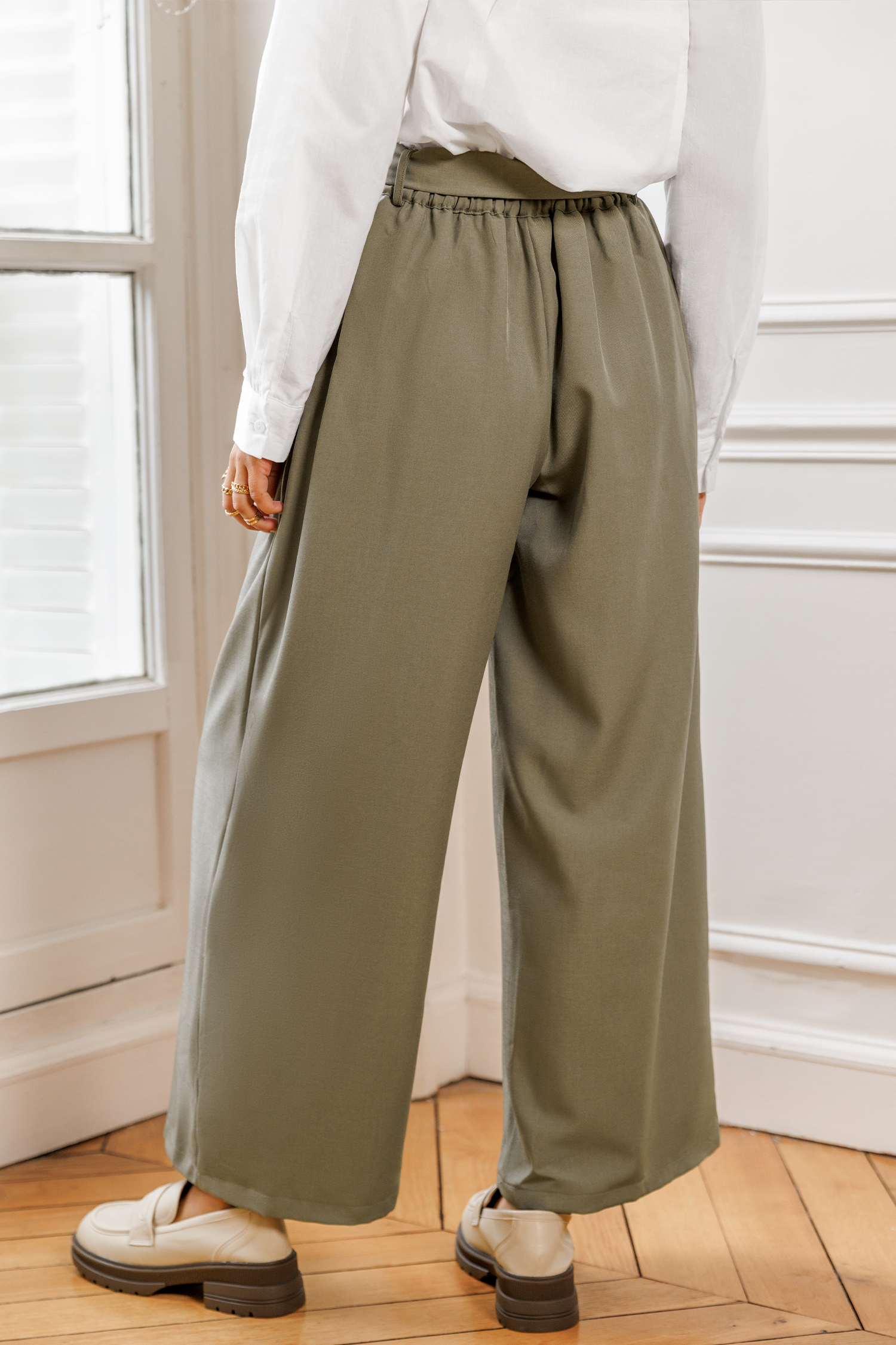 Le pantalon gris décontracté est chic et citadin ! Sa taille nouée, son pli à l’avant et sa coupe large en font un choix idéal du café du matin au dîner du soir.