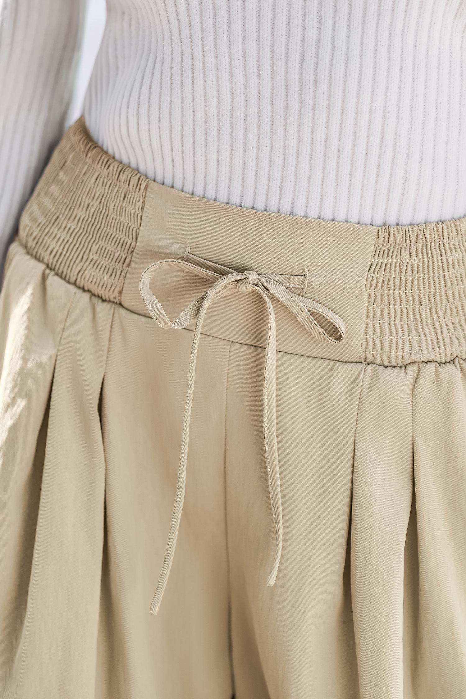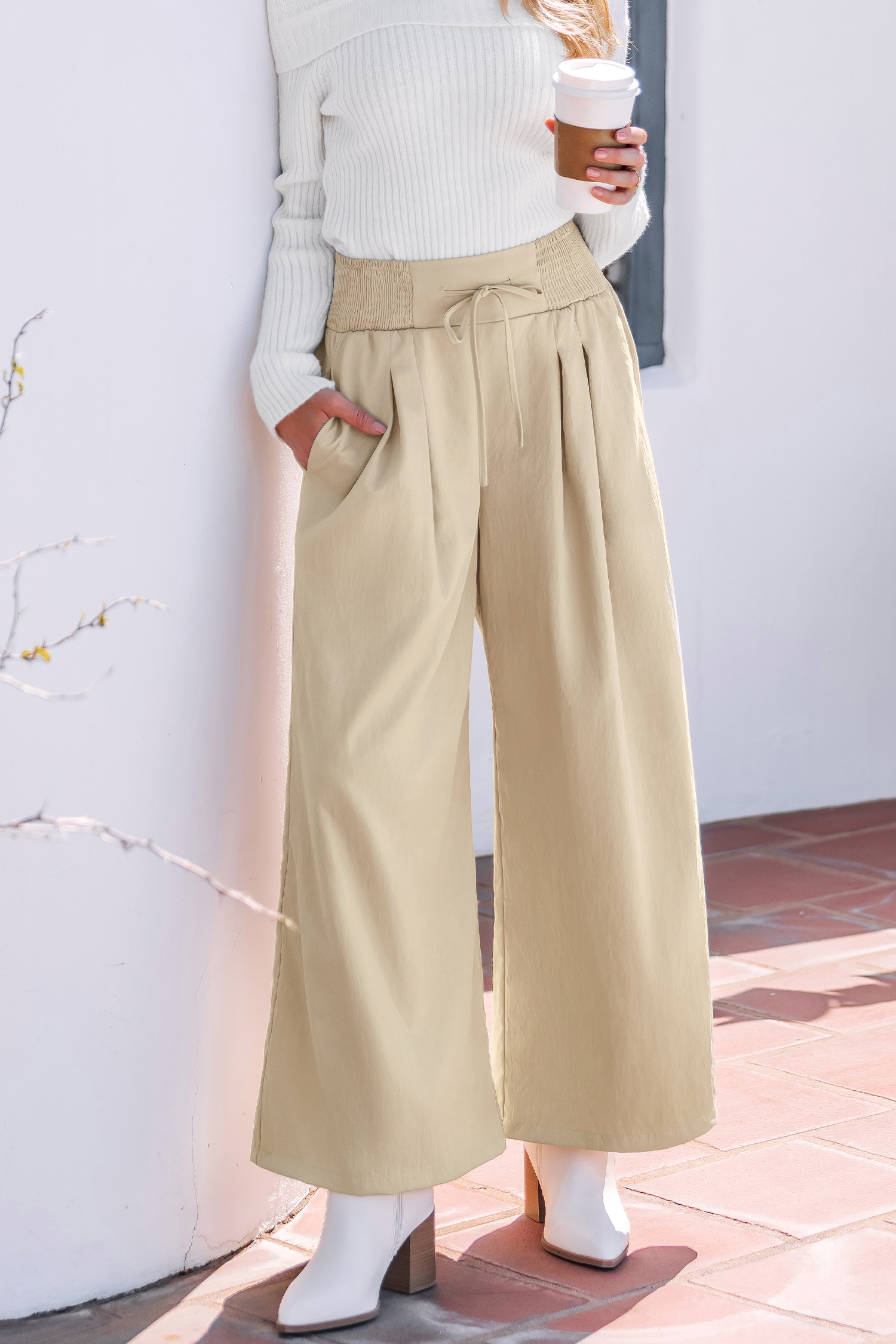 Un pantalon beige polyvalent et léger, parfait pour toutes les occasions ! Sa matière fluide, sa taille smockée, son cordon et sa coupe large allient confort et style décontracté.