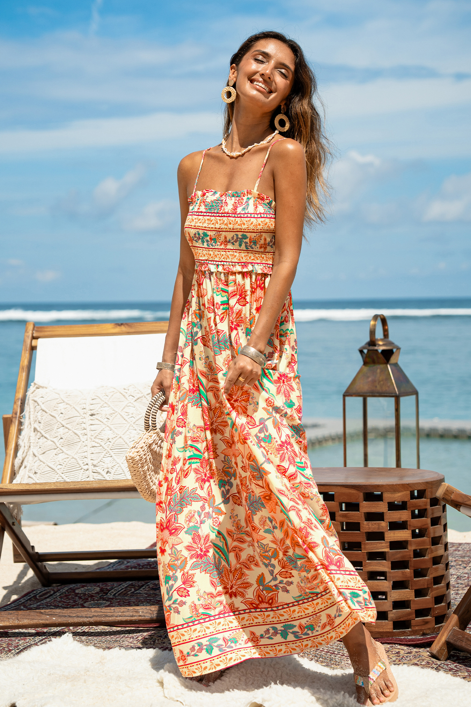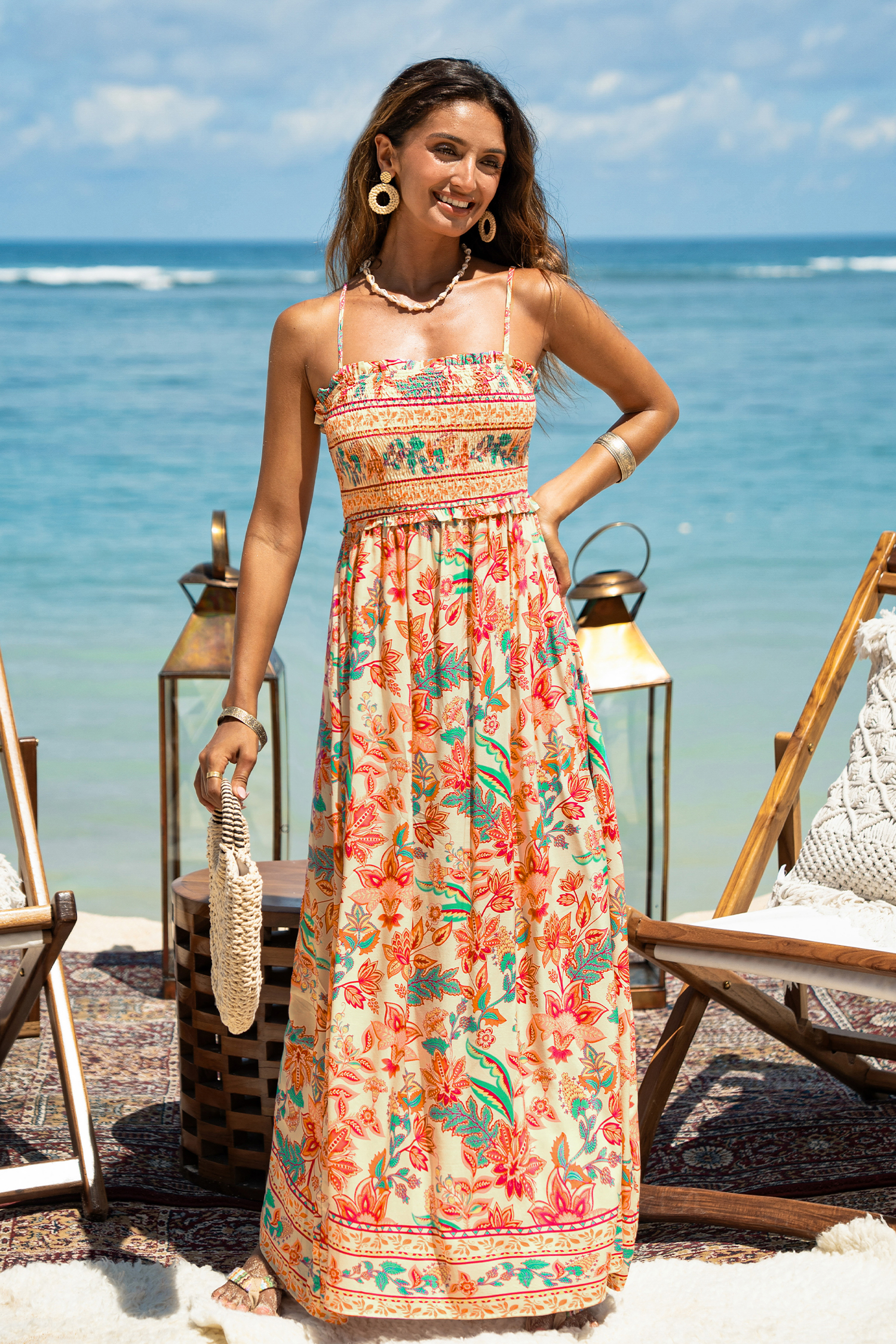 Cette robe fleurie légère est parfaite pour les journées ensoleillées comme les soirées détendues. Son encolure carrée et ses bretelles dégagées assurent fraîcheur, tandis que sa longueur maxi suit chacun de vos pas avec légèreté.