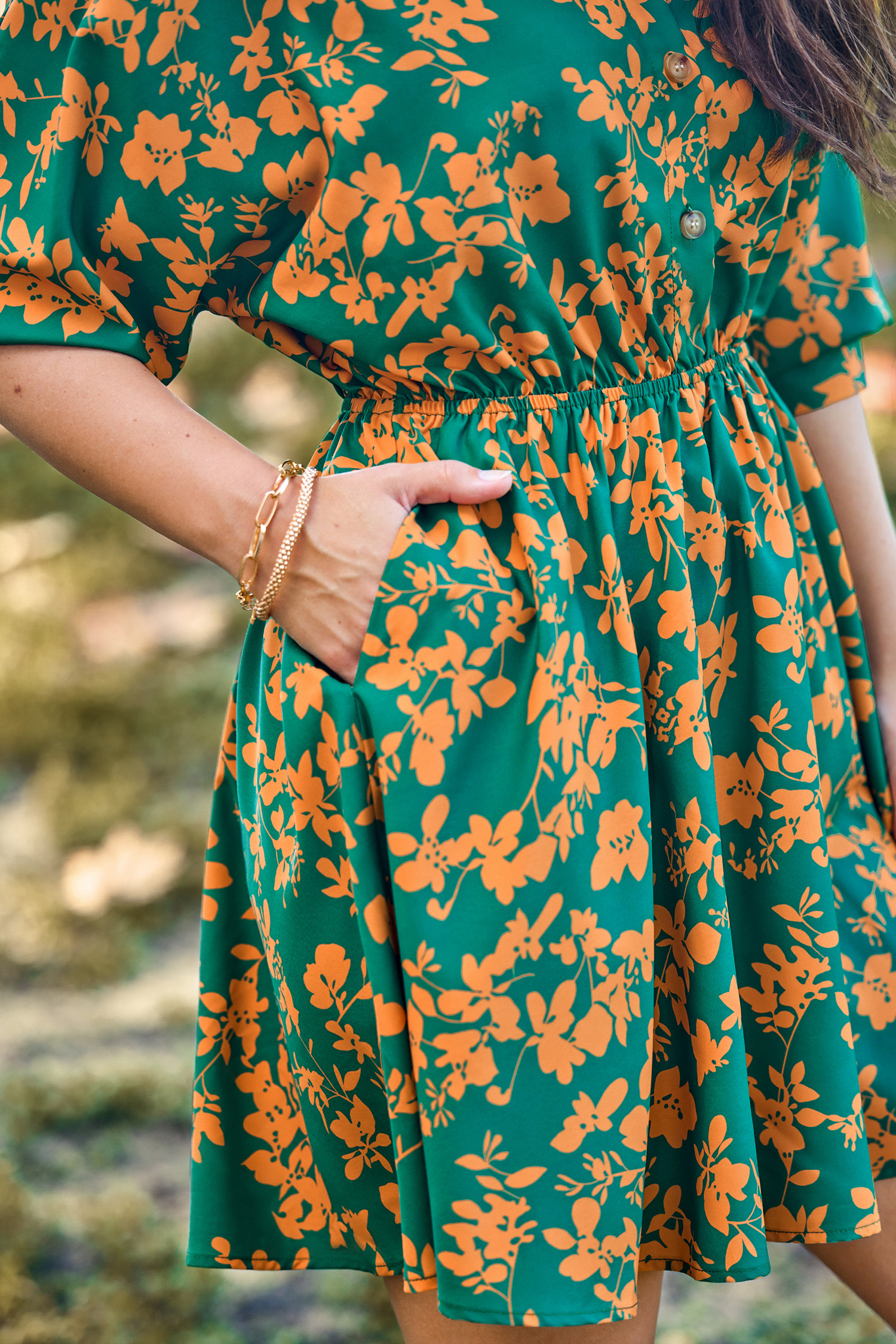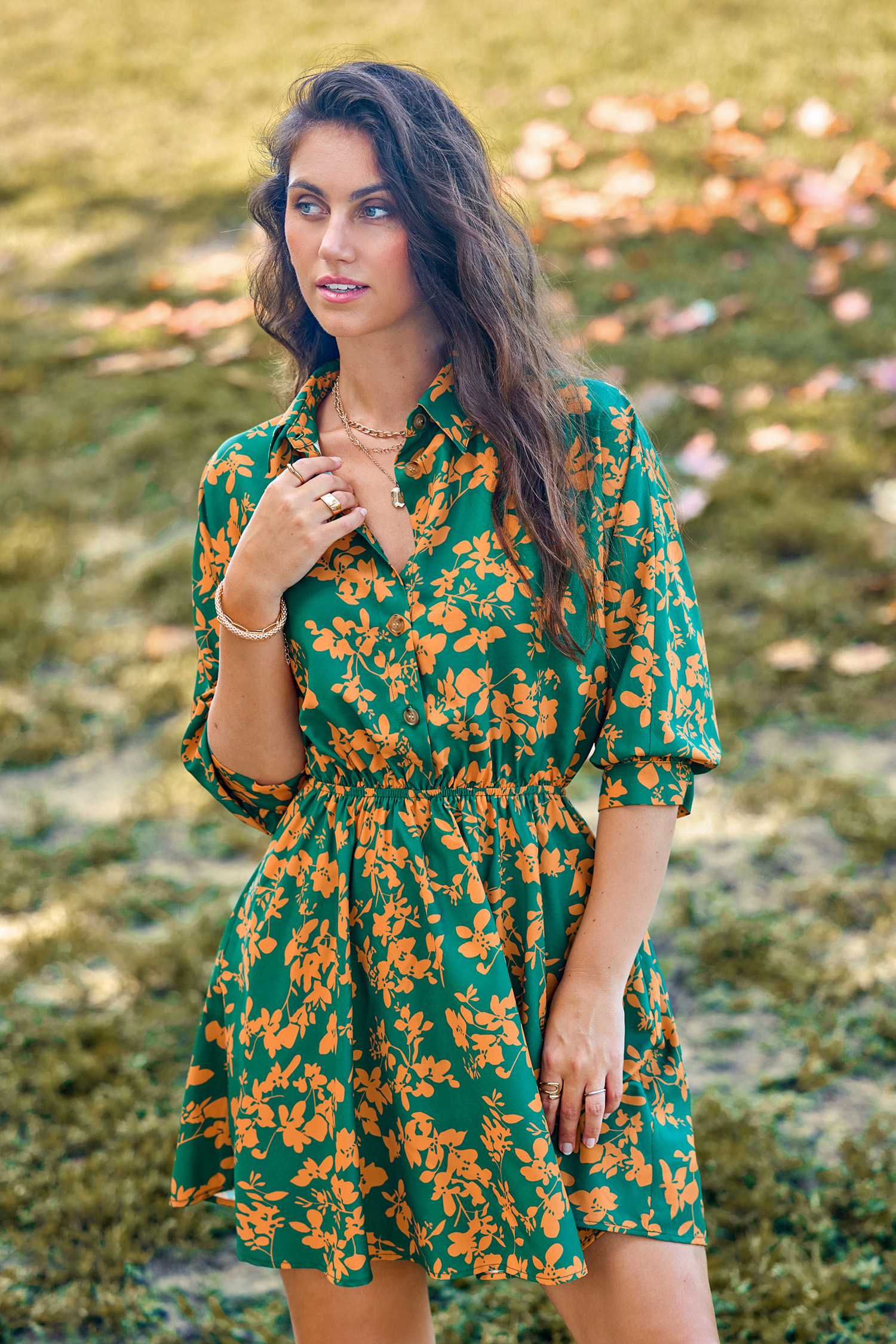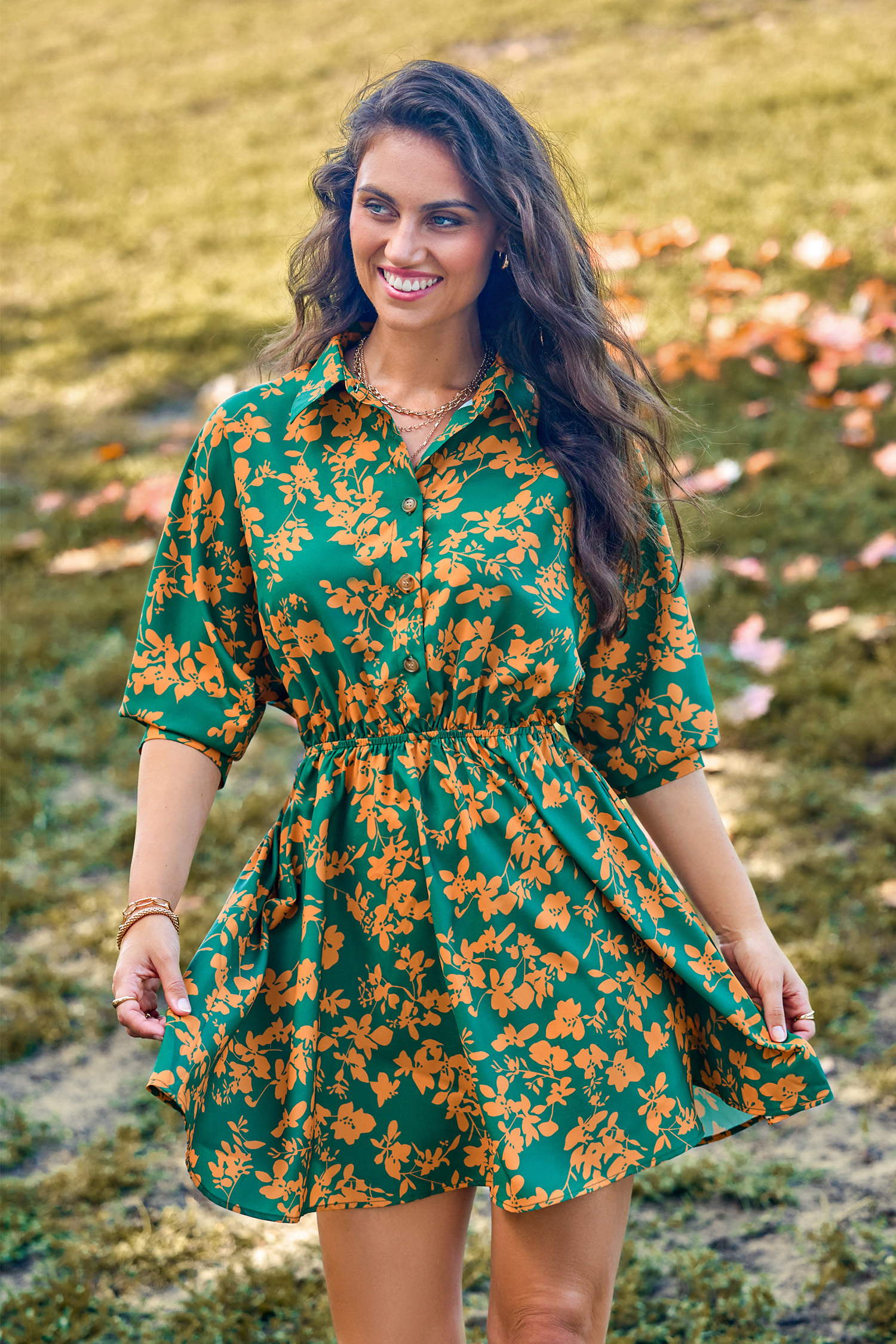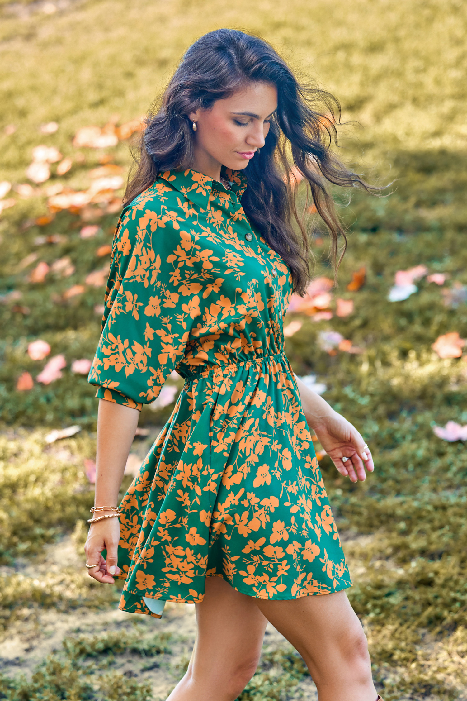 Robe courte à fleurs vertes et jaunes avec demi-manches