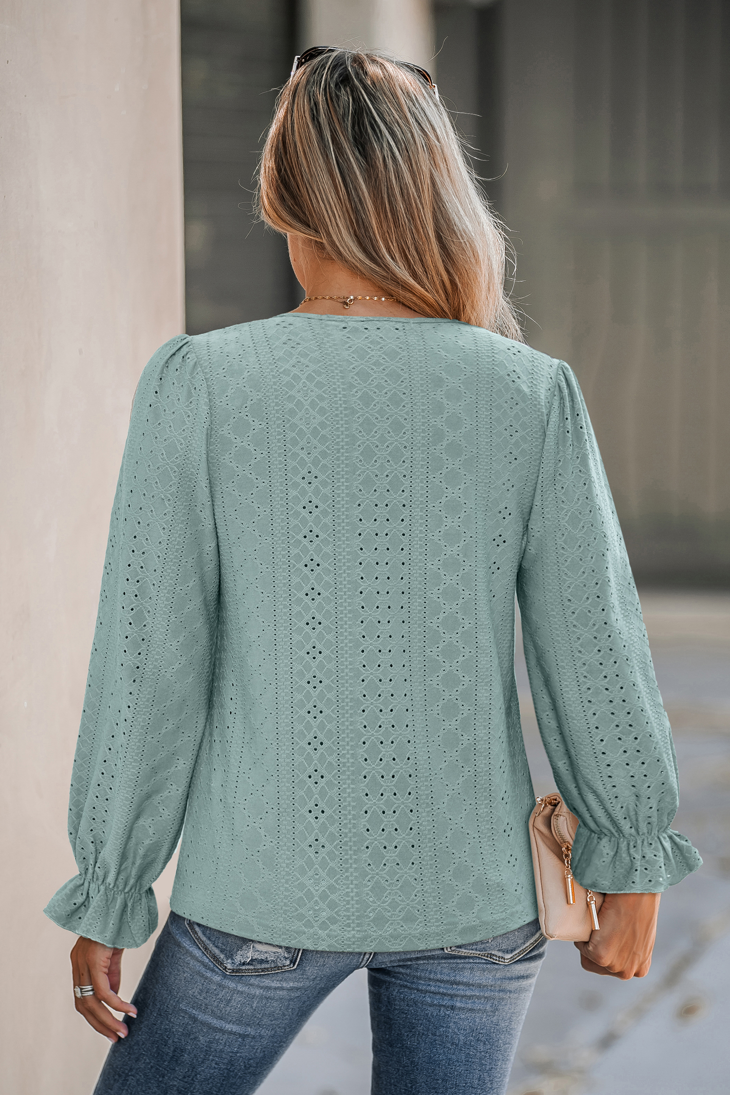 Ce haut vert associe structure et douceur pour un rendu féminin et assuré. Doté d’une encolure en V, de manches longues et de volants délicats, il équilibre parfaitement lignes nettes et détails raffinés.