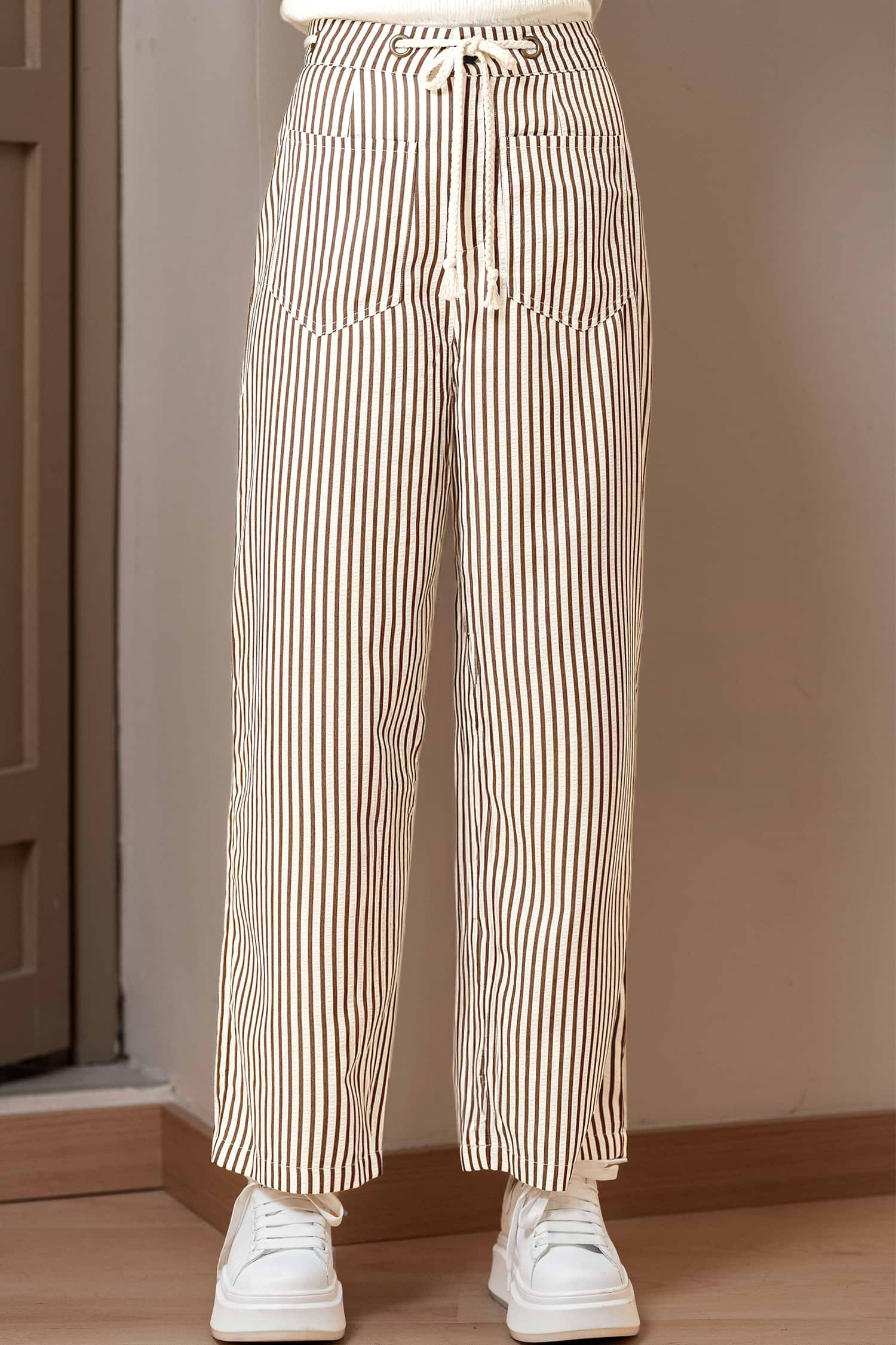 Le pantalon rayé dégage une allure chic et décontractée avec une touche bord de mer. Sa taille à cordon, ses poches et sa coupe droite en font une pièce idéale du brunch aux balades au coucher du soleil.
