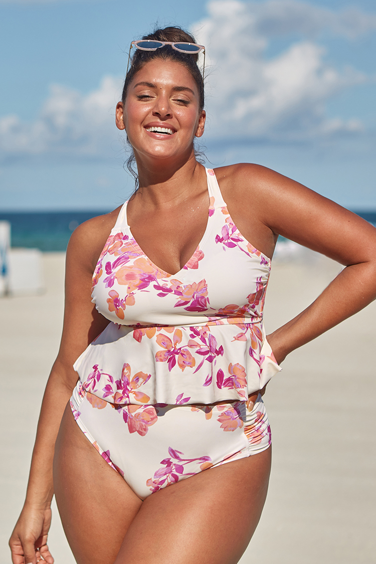 Haut de tankini grande taille à col en V et à volants au dos avec nœud à fleurs