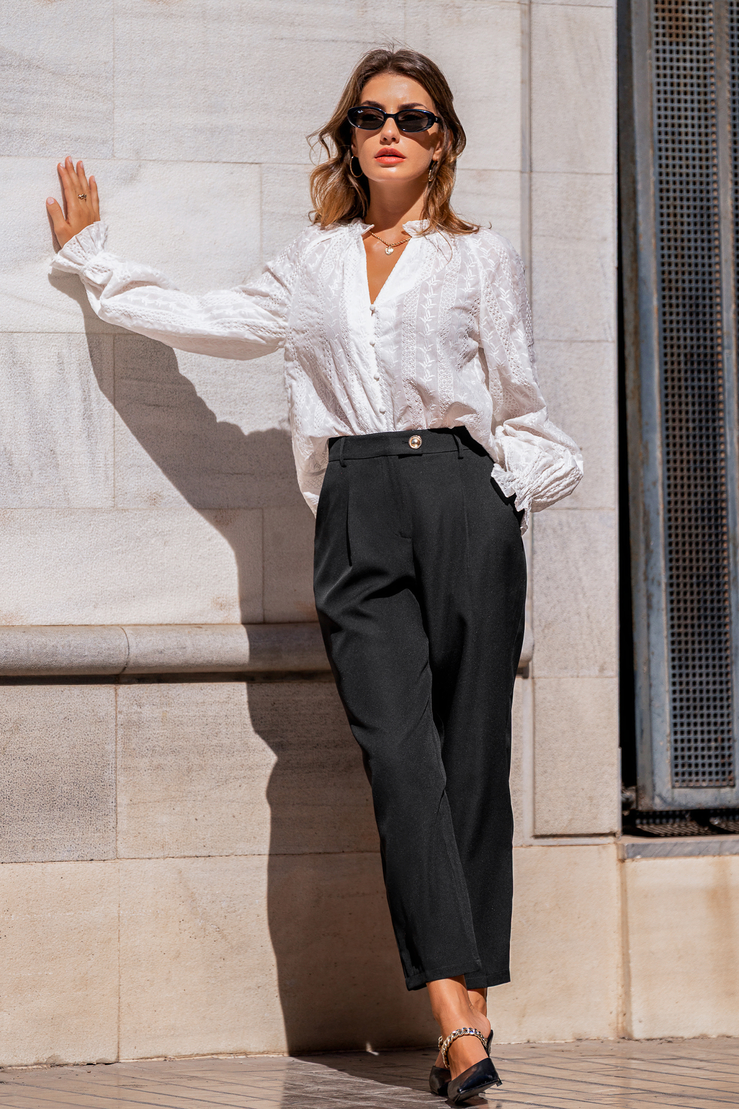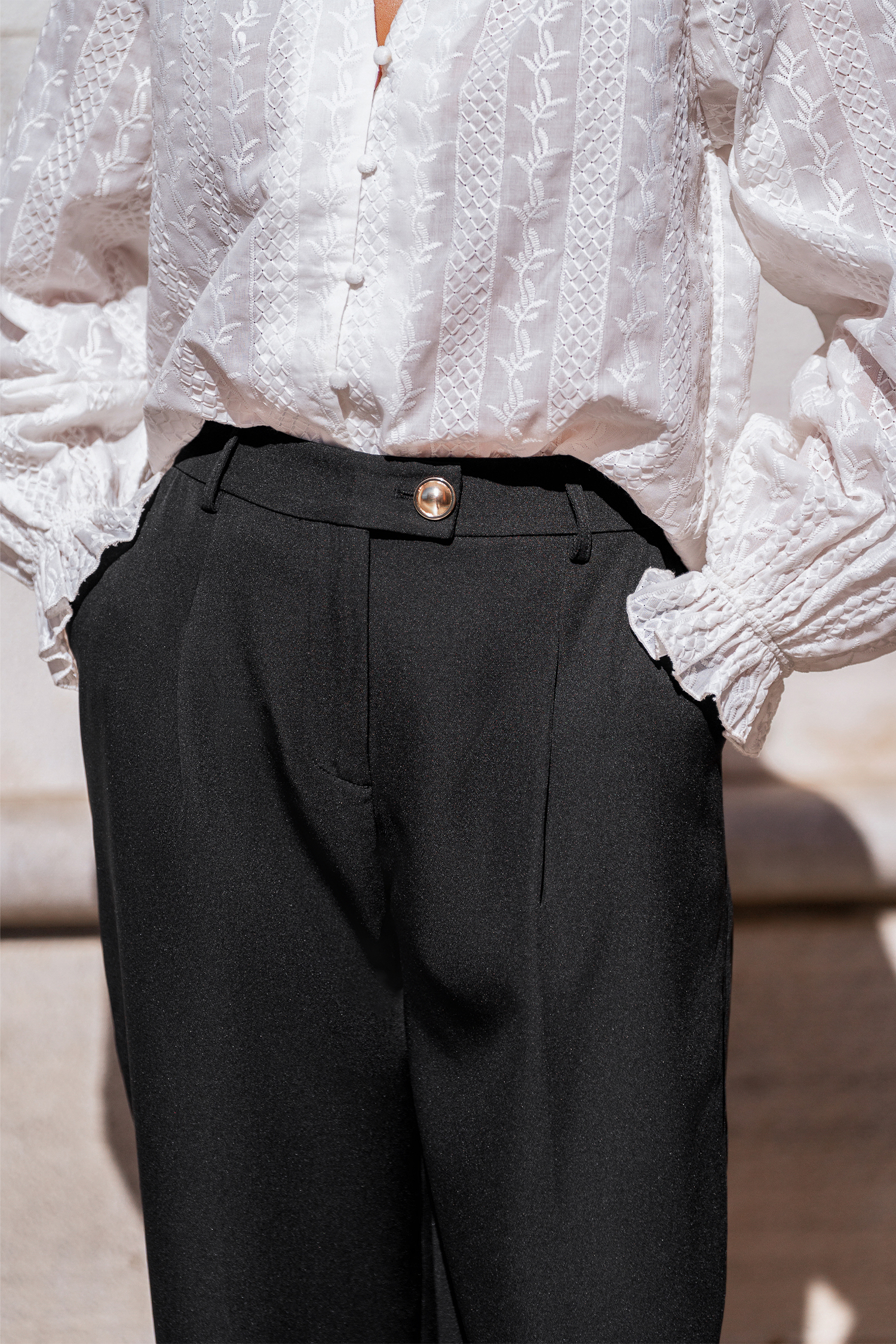 Commencez la journée du bon pied avec le pantalon noir élégant ! Ses passants de ceinture, ses plis et sa coupe droite offrent un look à la fois soigné et décontracté.