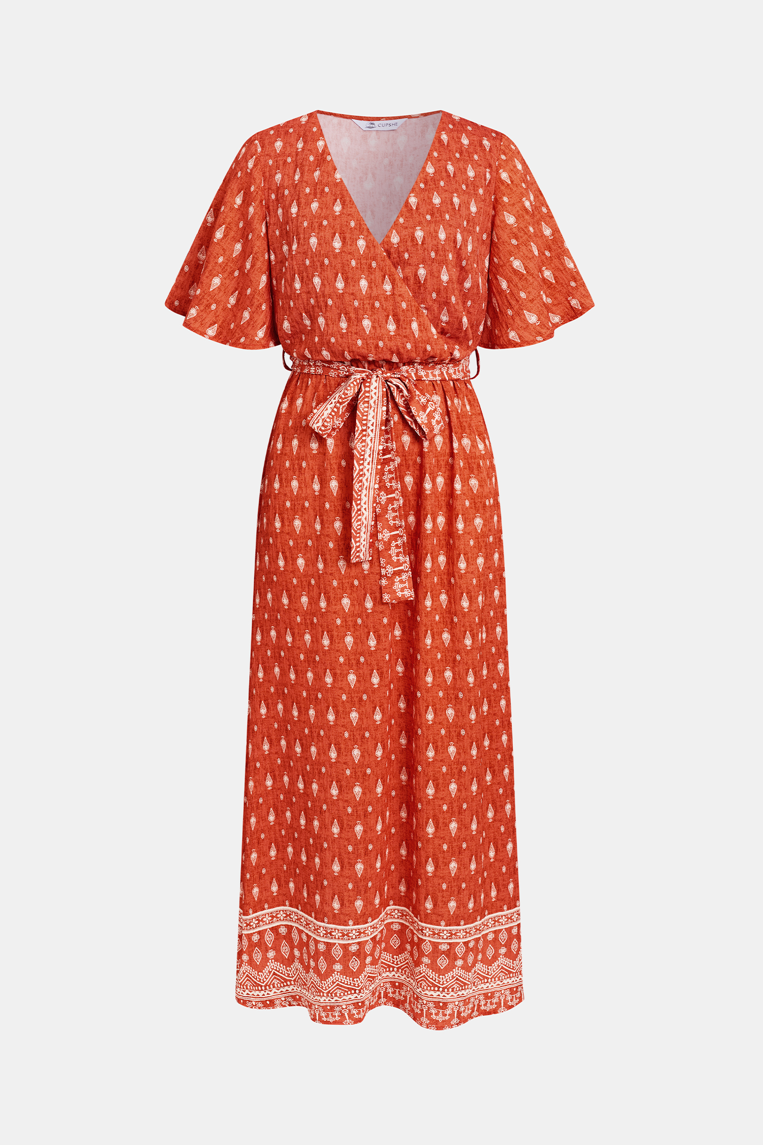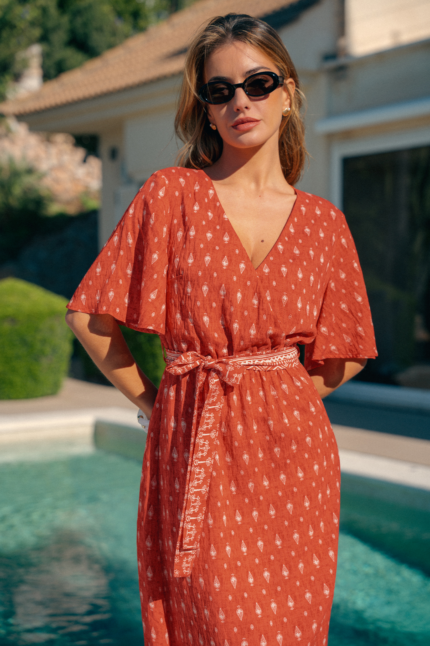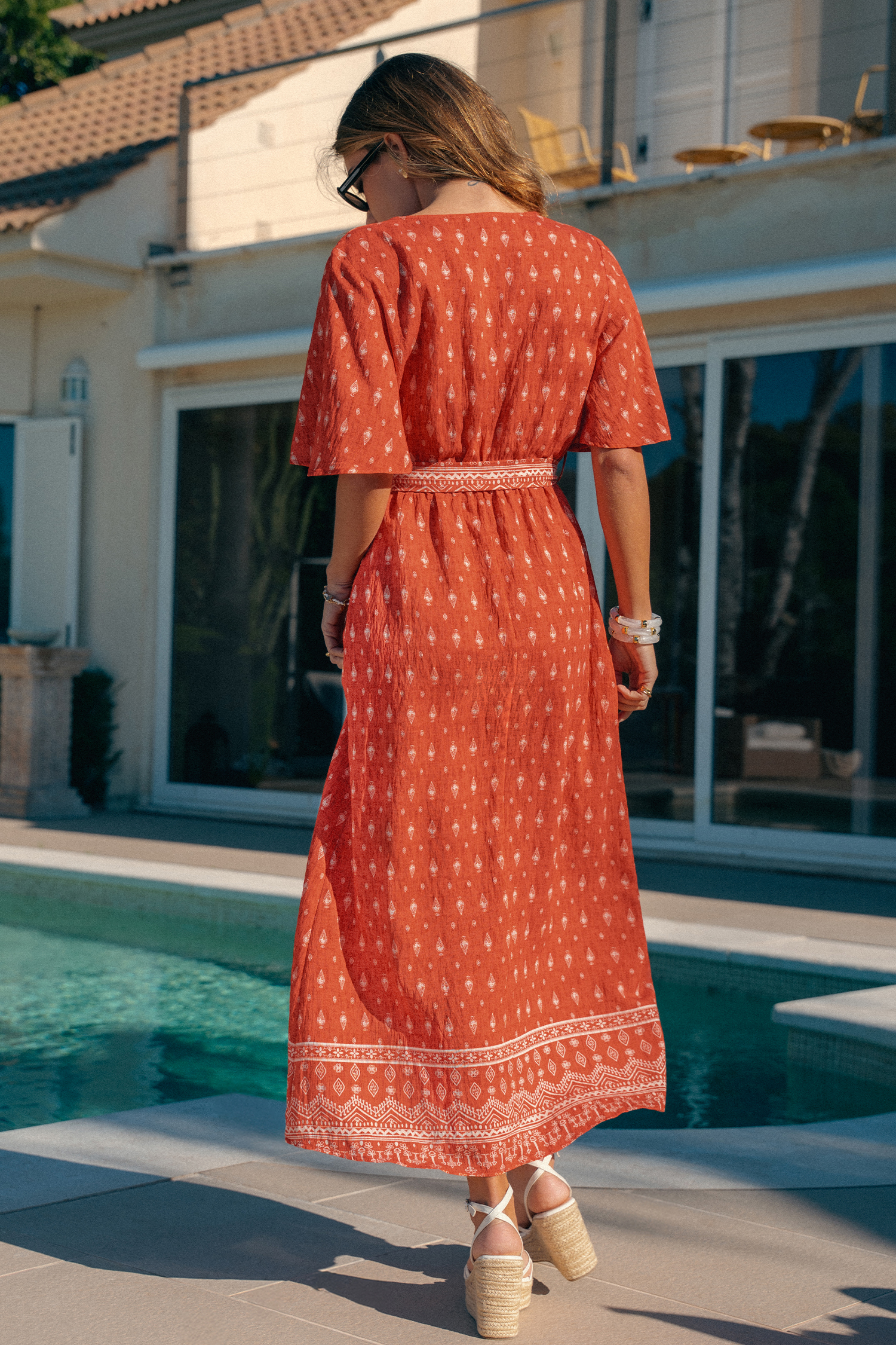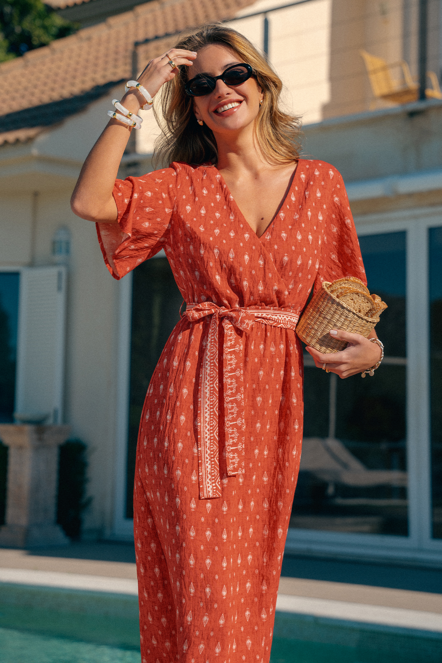 Cette robe longue ornée apporte une touche de caractère tout en restant fluide. Son décolleté croisé, ses manches courtes, sa ceinture à nouer et sa longueur maxi dessinent une silhouette flatteuse et élégante.