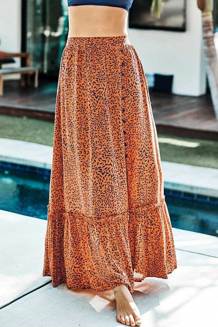 Jupe longue boutonnée à imprimé feuilles dorées et bleu marine