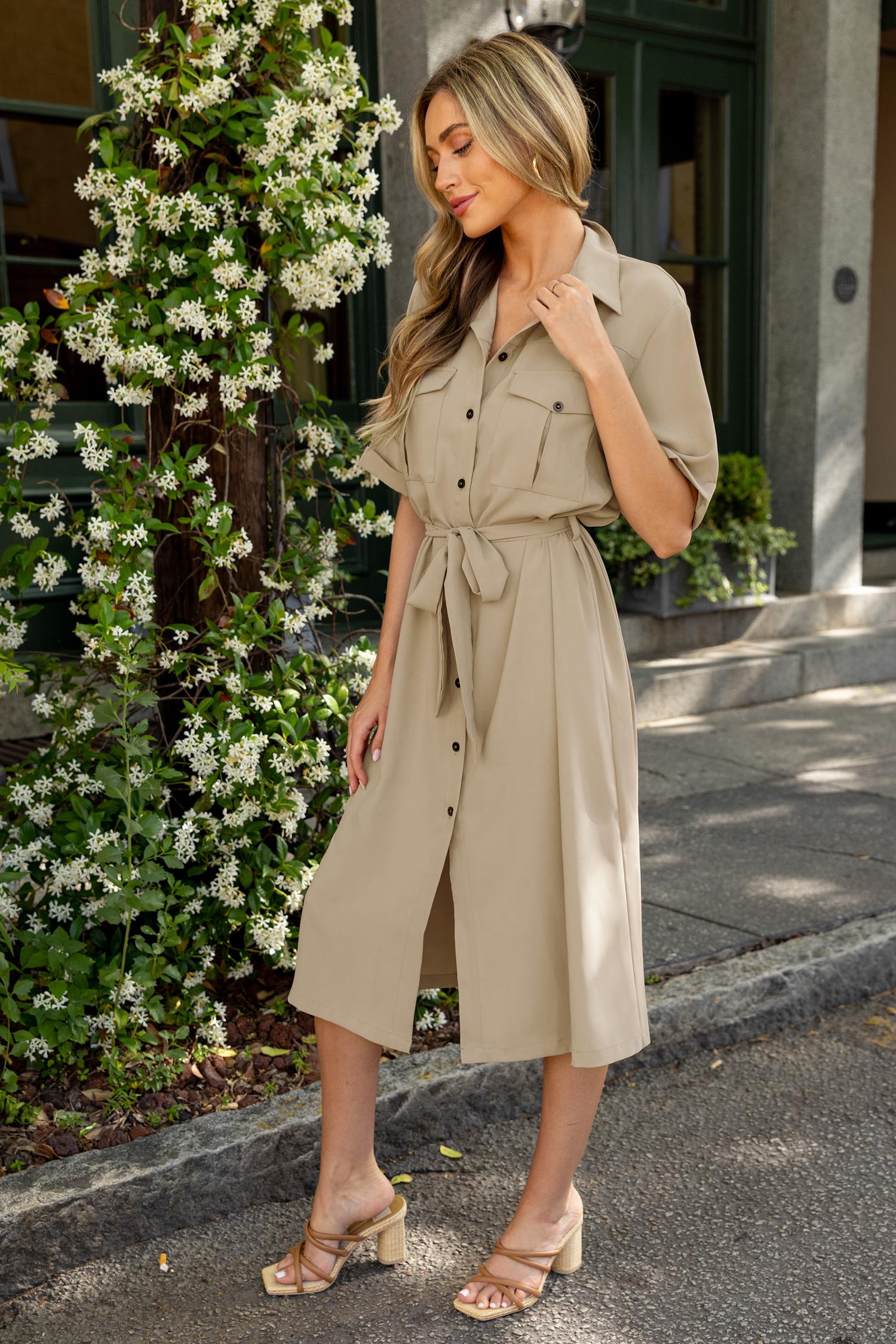 HomeRobe chemise midi à boutons sur le devant kaki