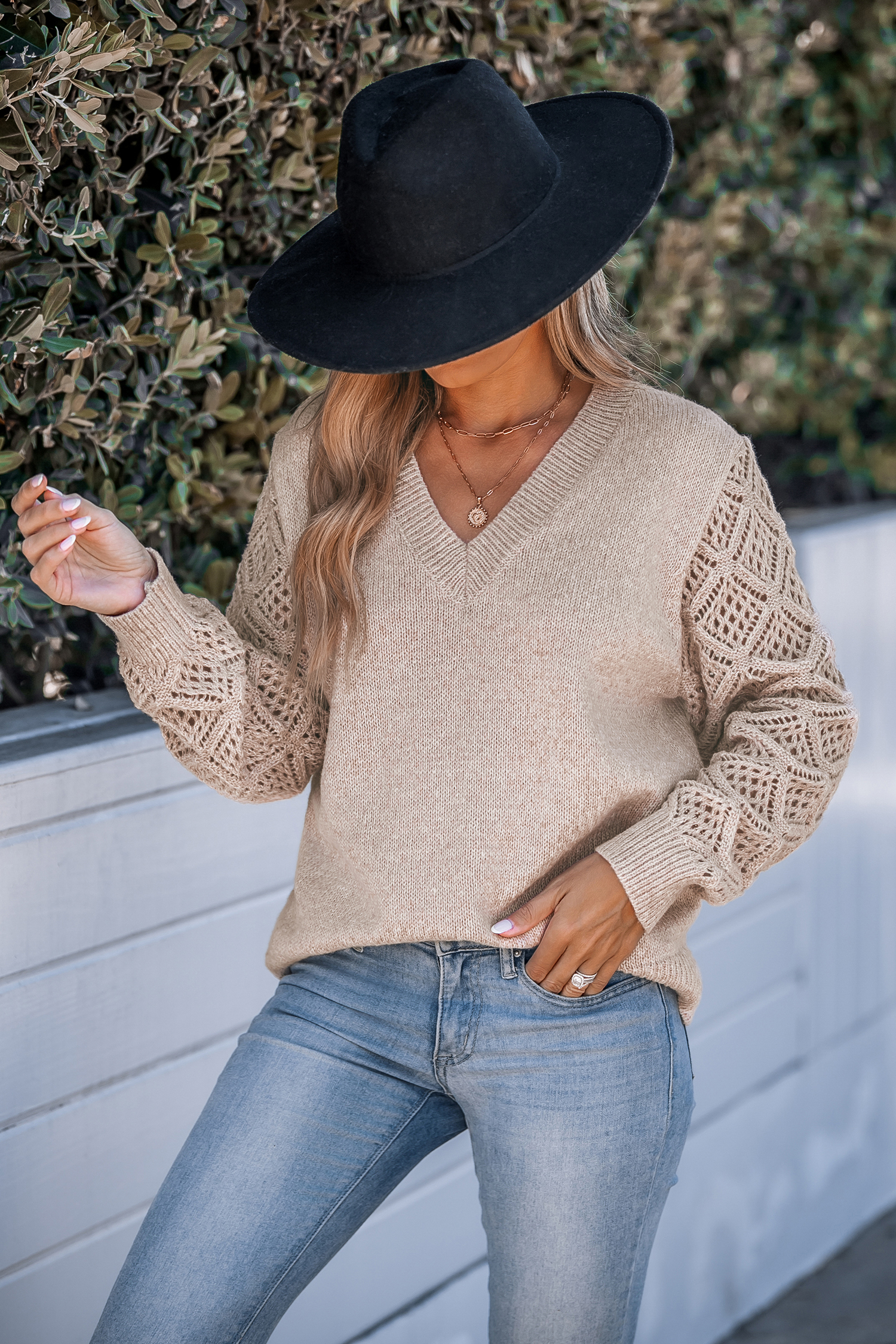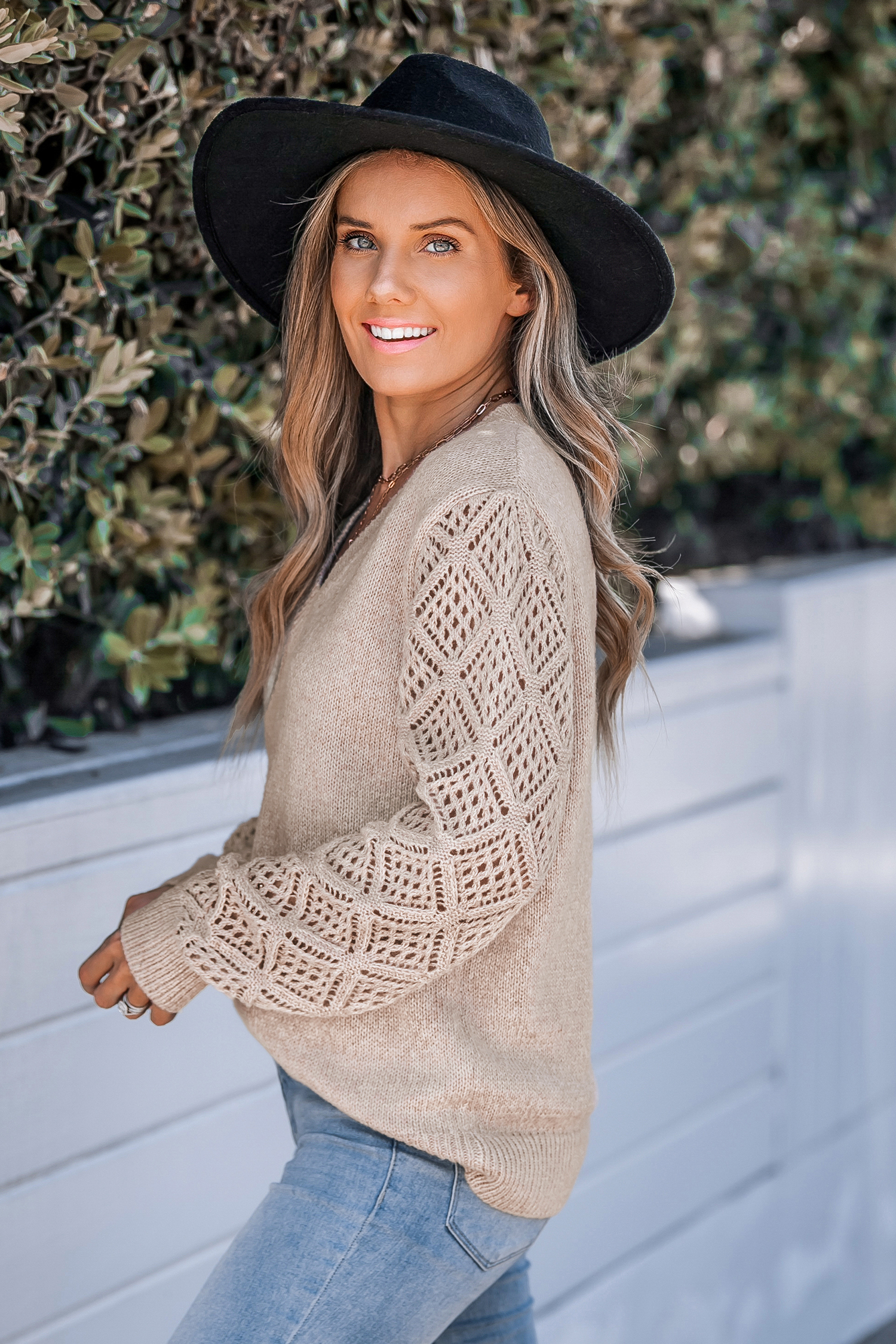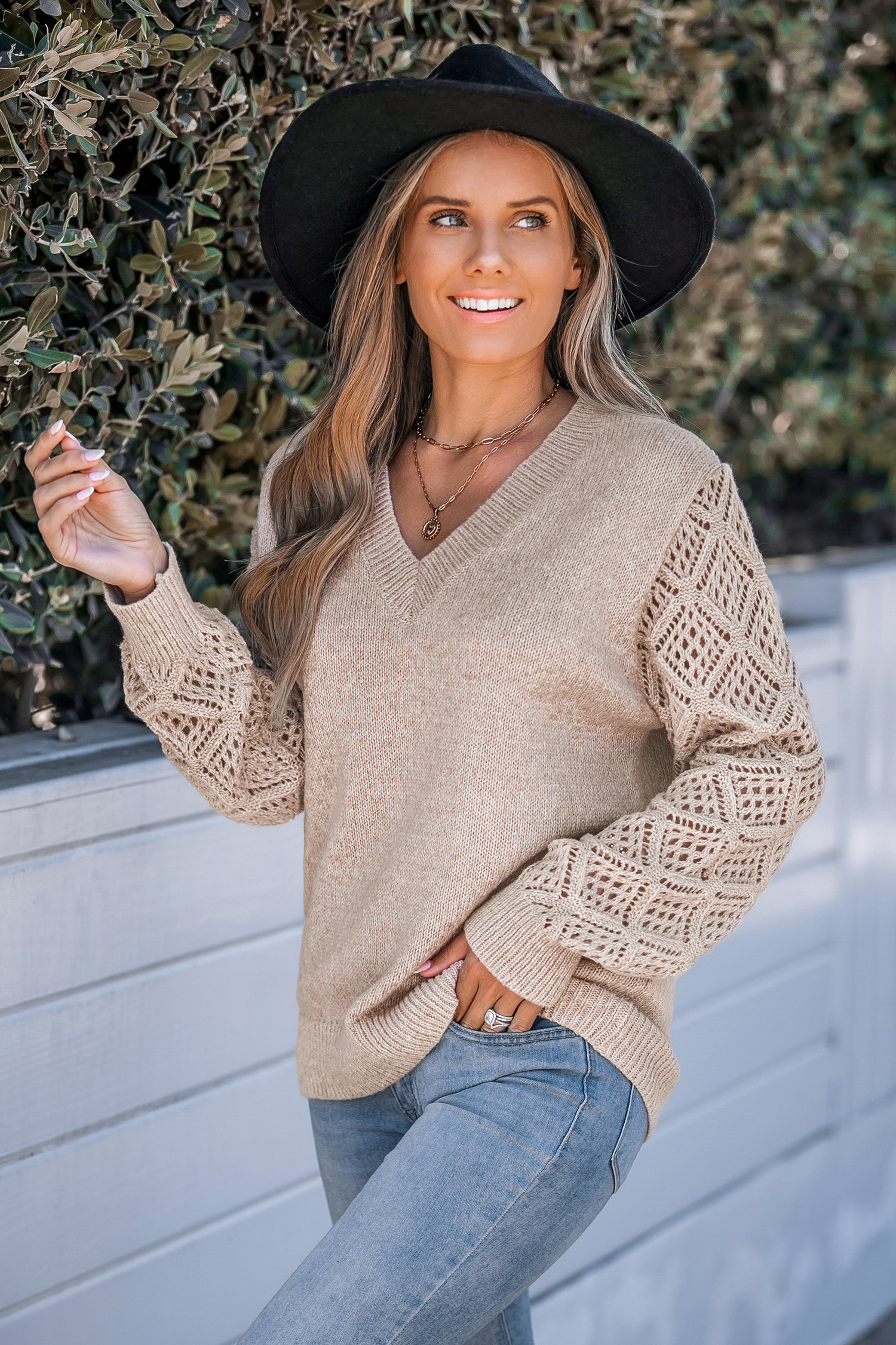 C'est déjà le temps des pulls ? Le pull à col en V et manches en crochet kaki est votre ticket pour être à la fois confortable et élégante. Avec ses manches ludiques, c'est comme donner un high-five à vos bras tout en gardant les choses au frais sans effort.