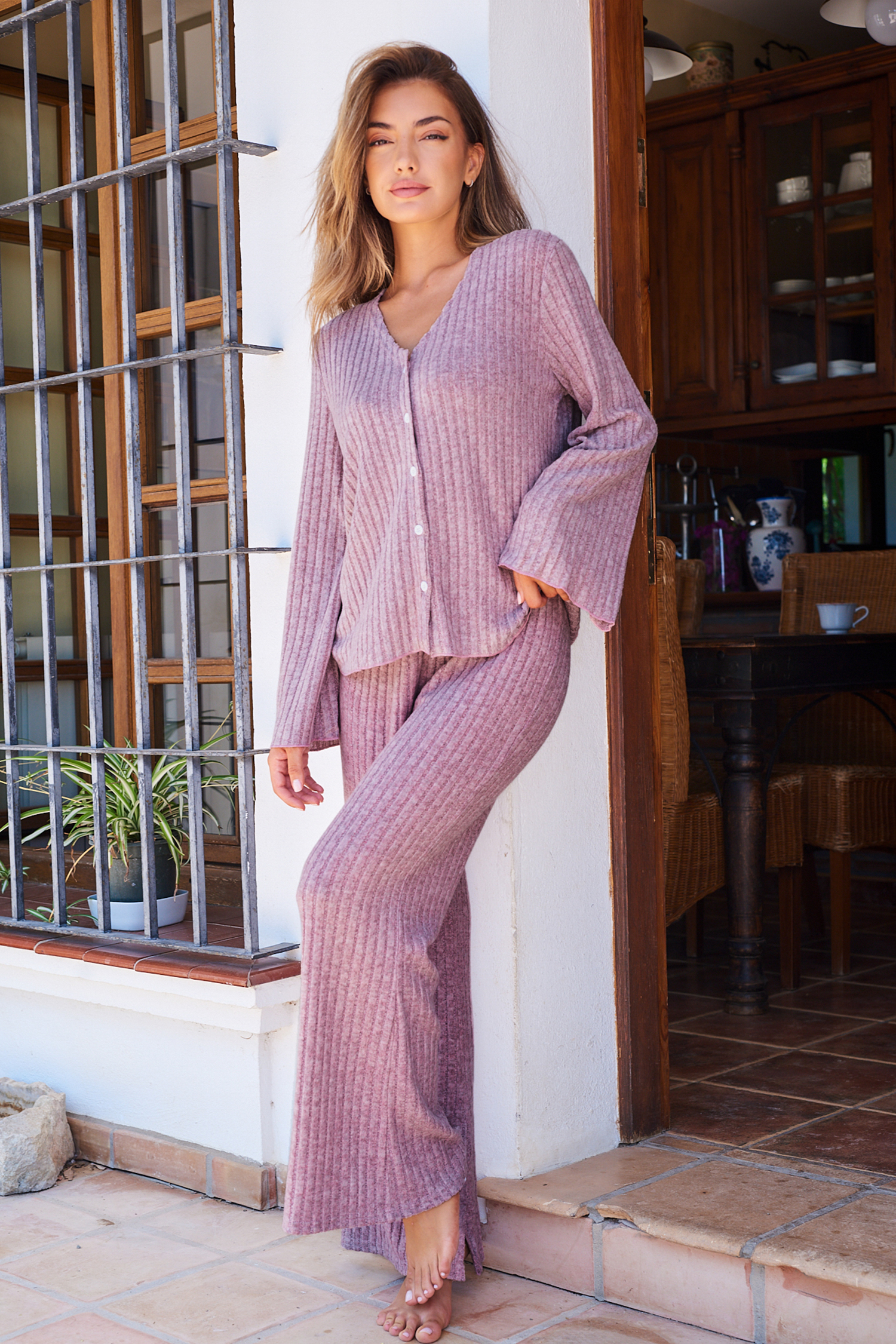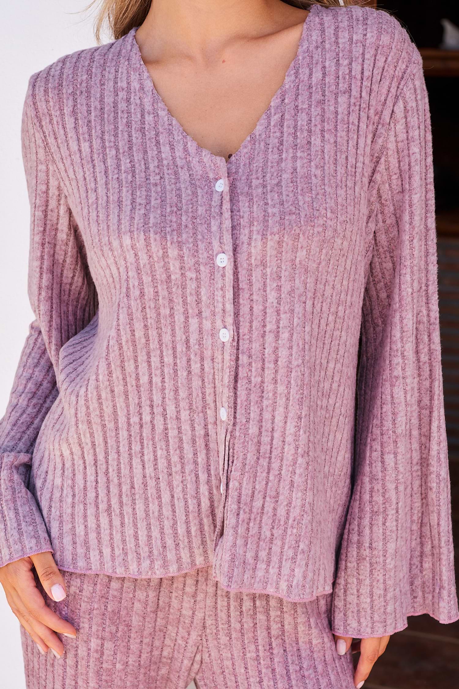 Ensemble pyjama côtelé haut à manches longues et pantalon évasé lavande