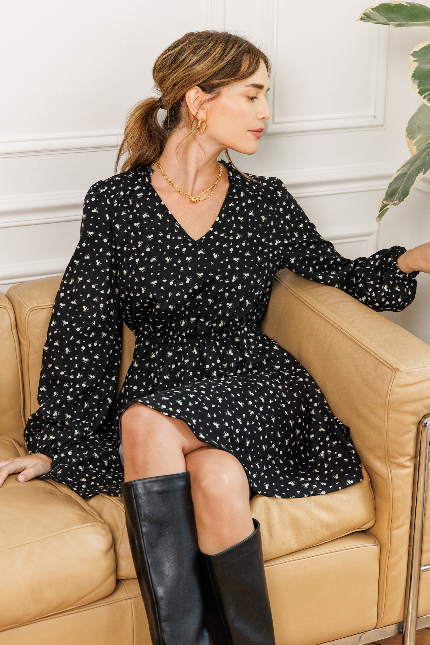 La robe fleurie à petites marguerites est légère et pleine de charme ! Son décolleté en V, ses manches longues et sa coupe mini lui confèrent une allure insouciante, idéale pour les journées ensoleillées.