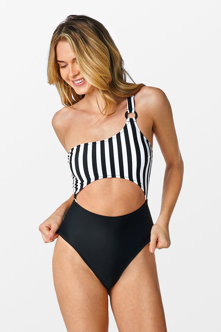 Maillot de bain une pièce asymétrique rayé à découpes avec anneau