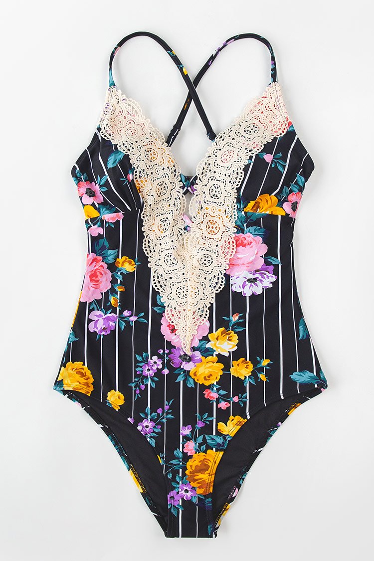 Maillot de bain une pièce décolleté plongeant imprimé floral noir
