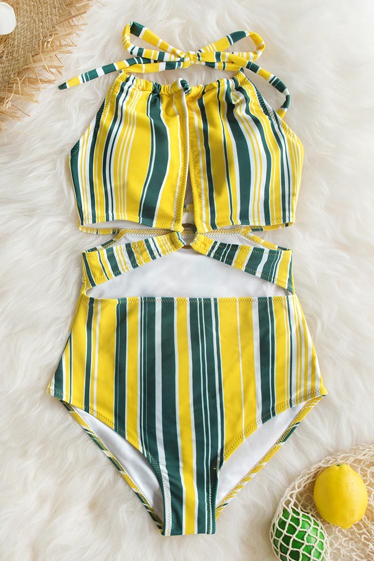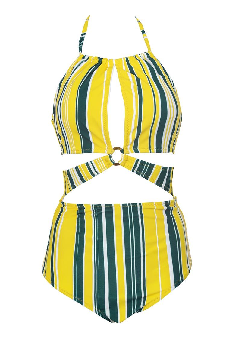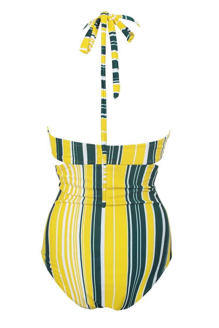 Maillot de bain une-pièce imprimé rayé gris jaune et blanc