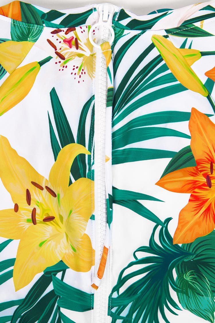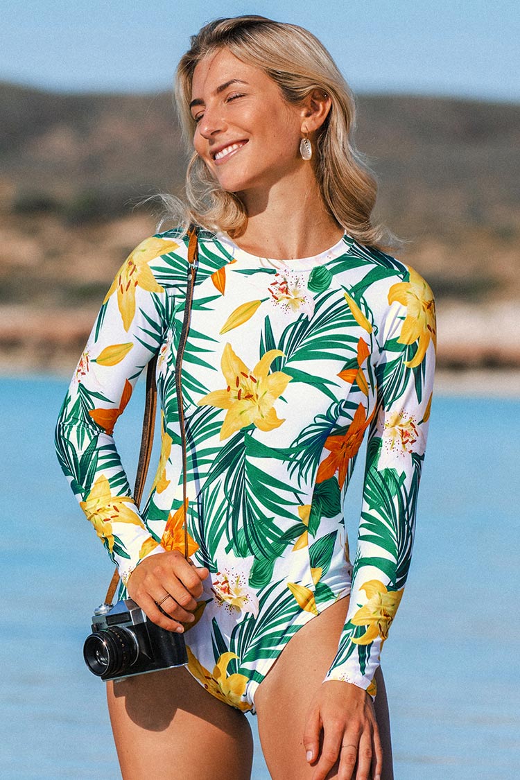 Maillot une pièce à manches longues et imprimé floral et tropical