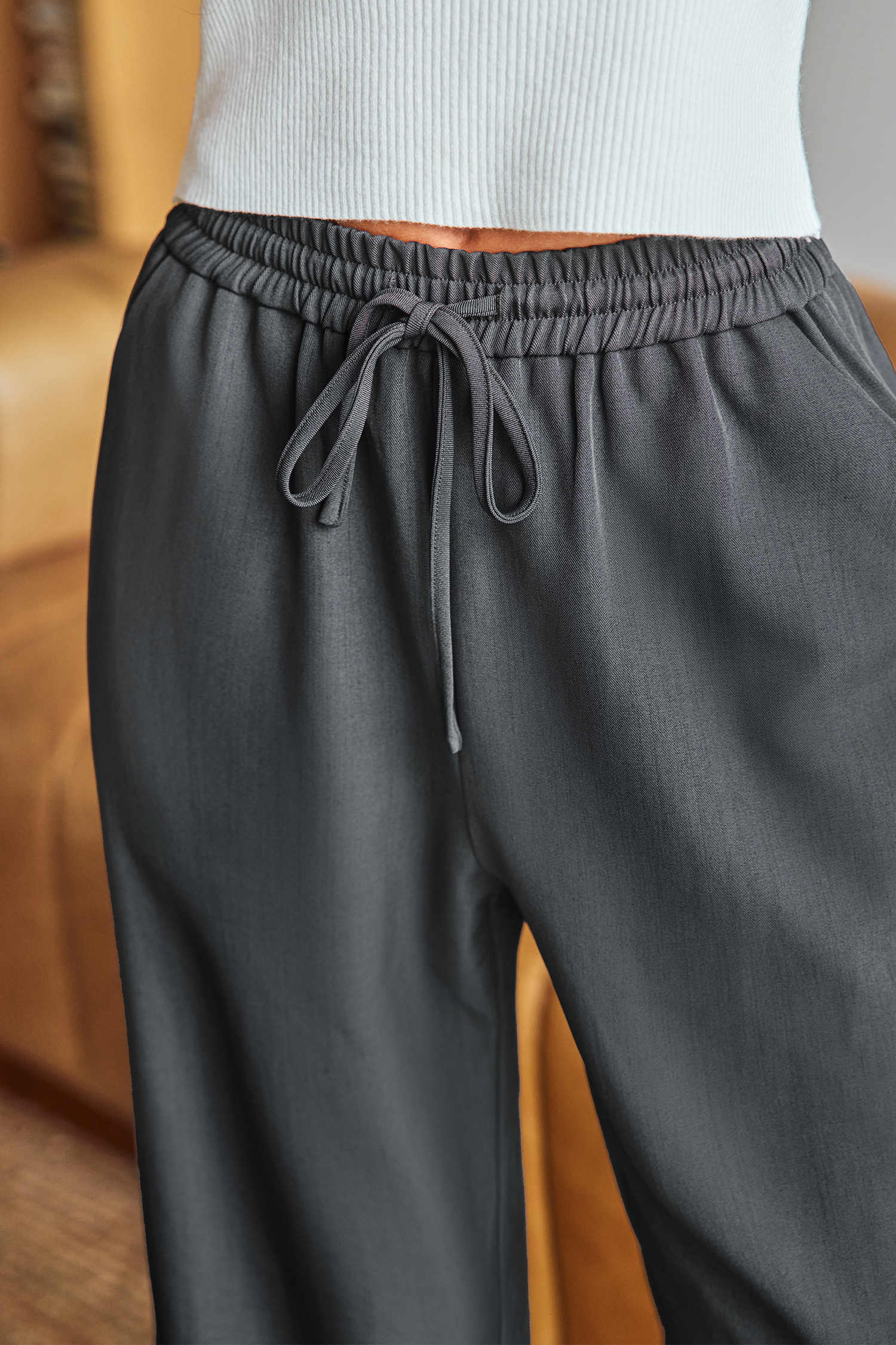 Ce pantalon gris apporte une énergie cosy et détendue à vos looks du quotidien ! Sa taille à cordon de serrage et sa coupe droite offrent une silhouette confortable et sans effort, parfaite pour se détendre ou sortir faire des courses.