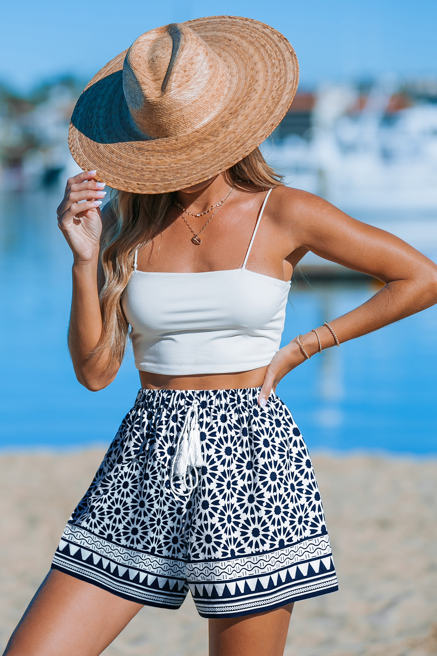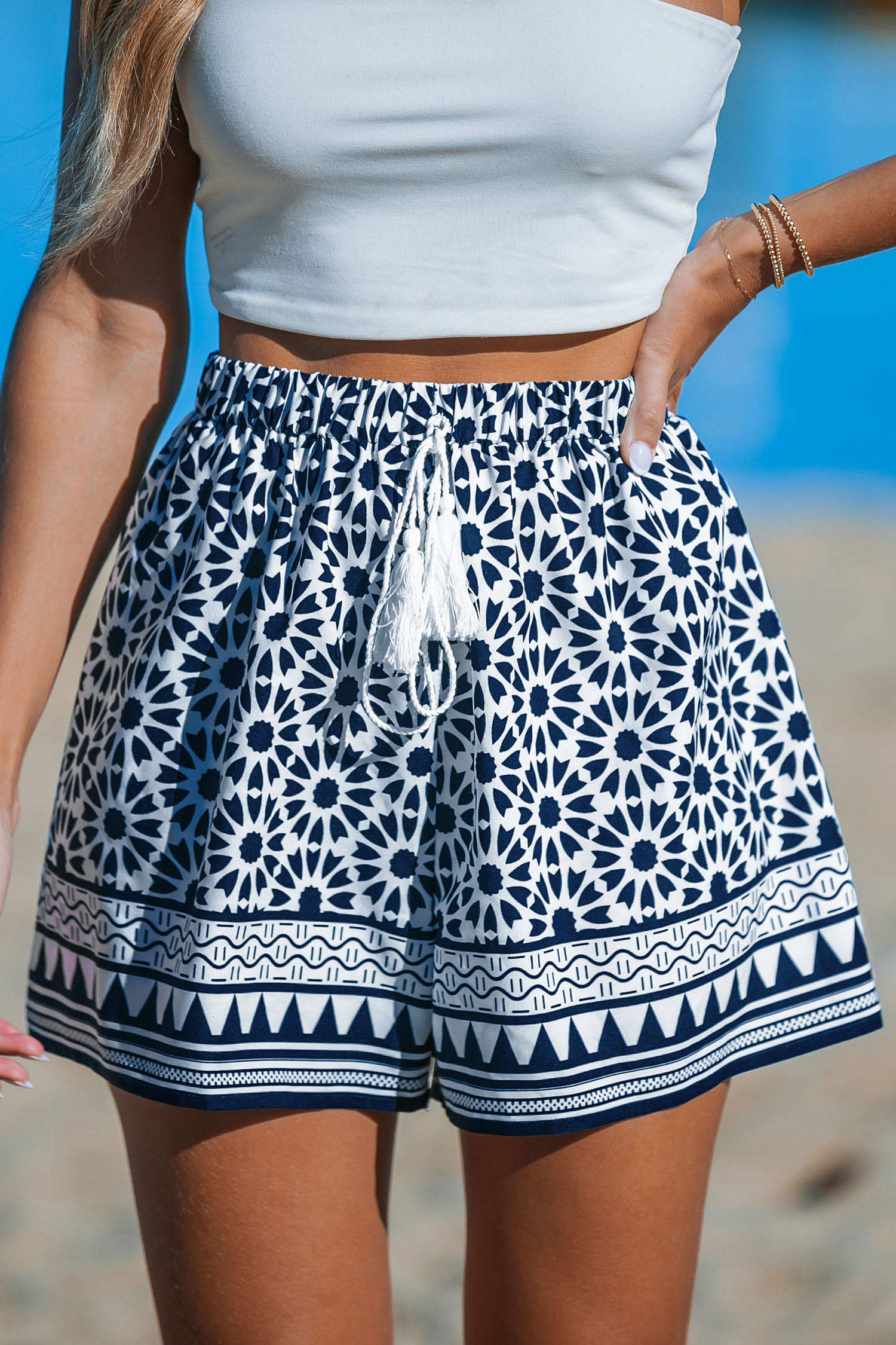 Short à jambes évasées géométriques bleu marine et blanc