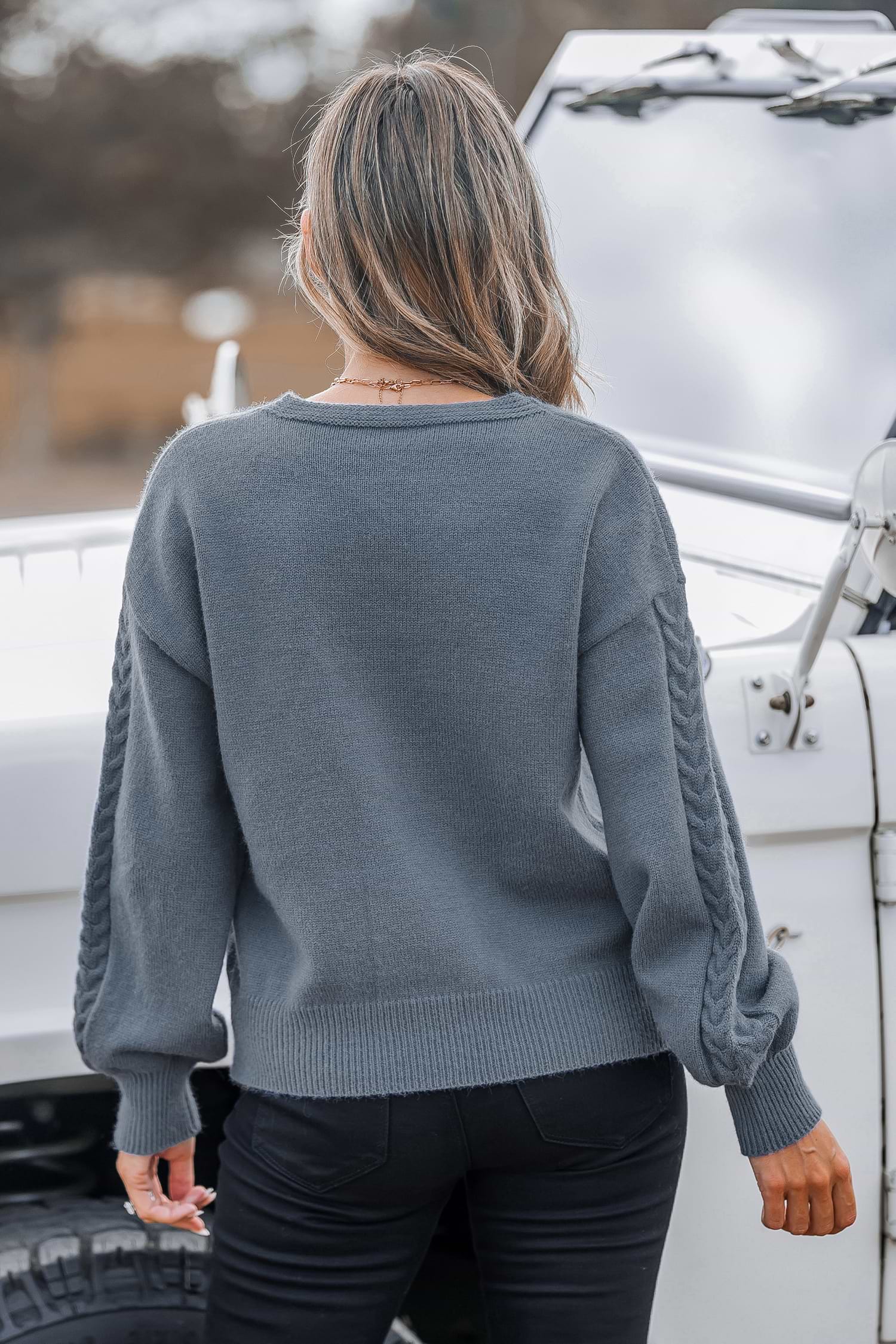 Pull en tricot côtelé à col en V et manches longues bleu marine