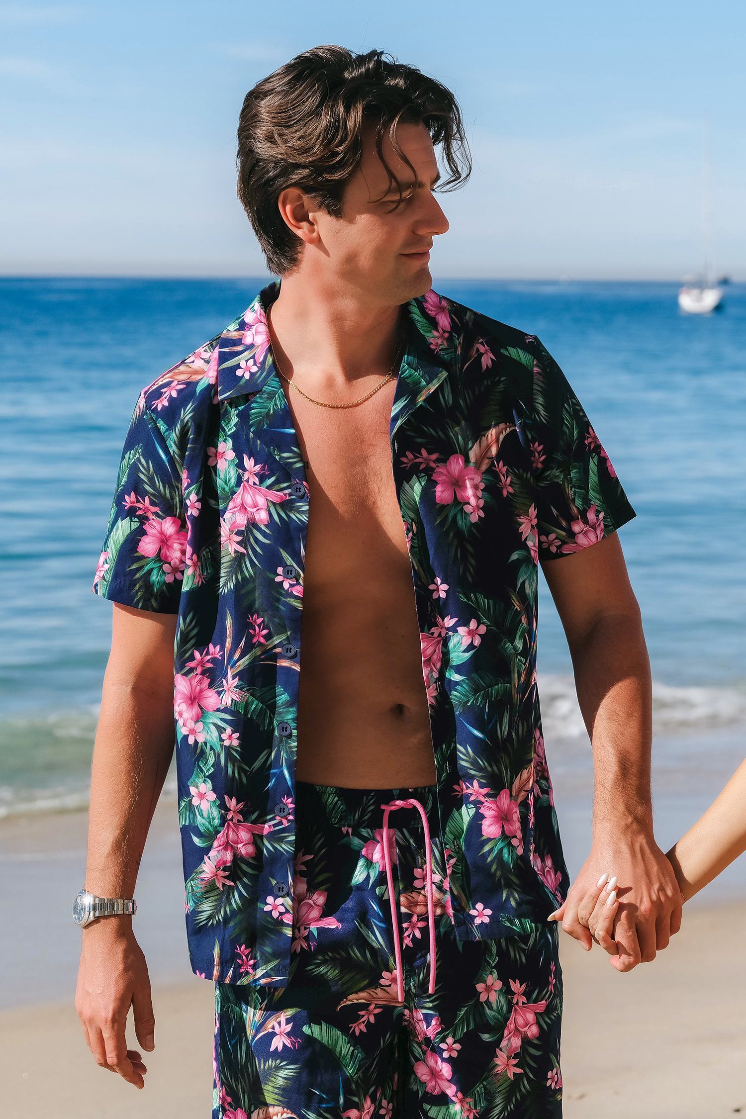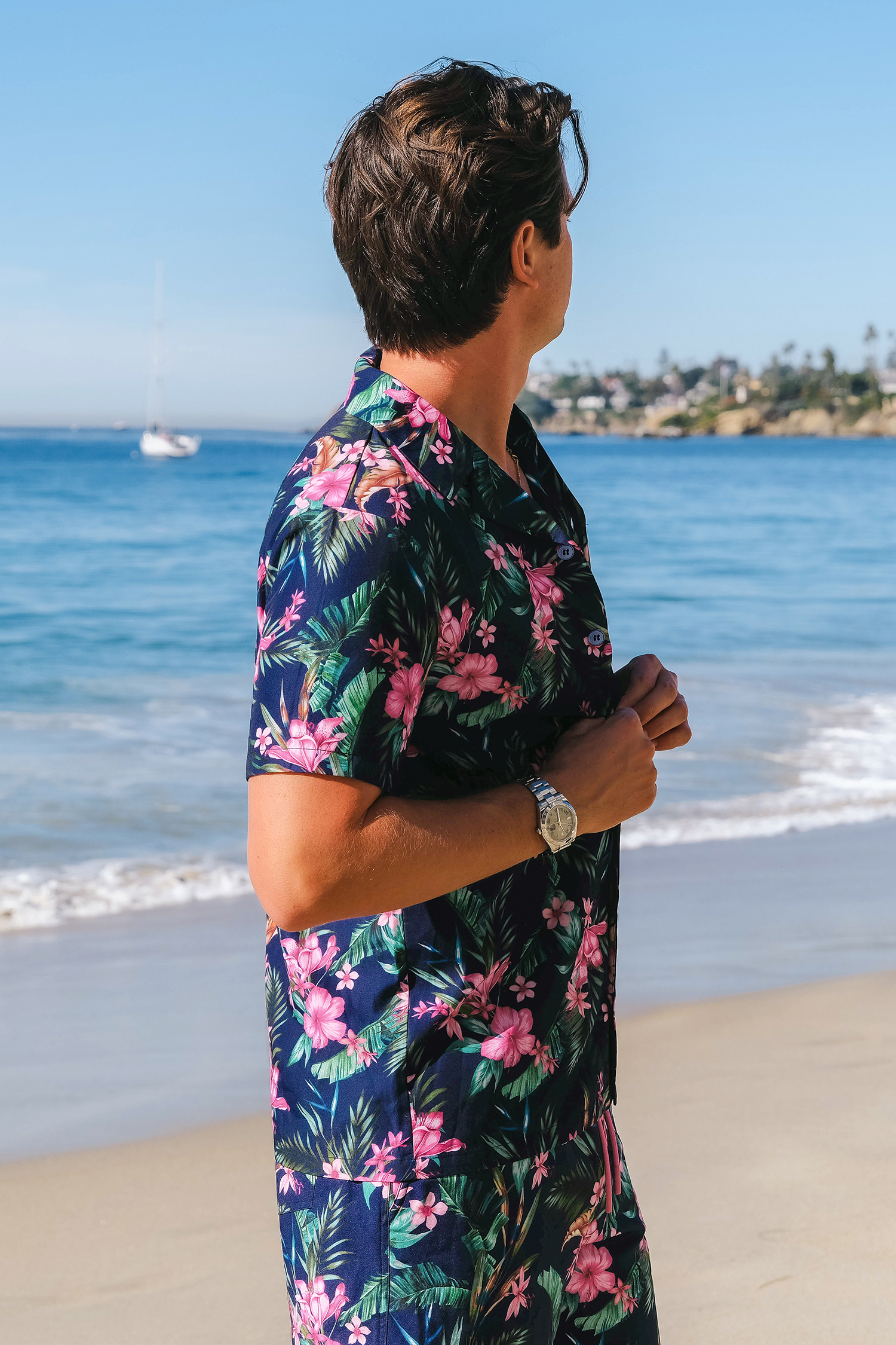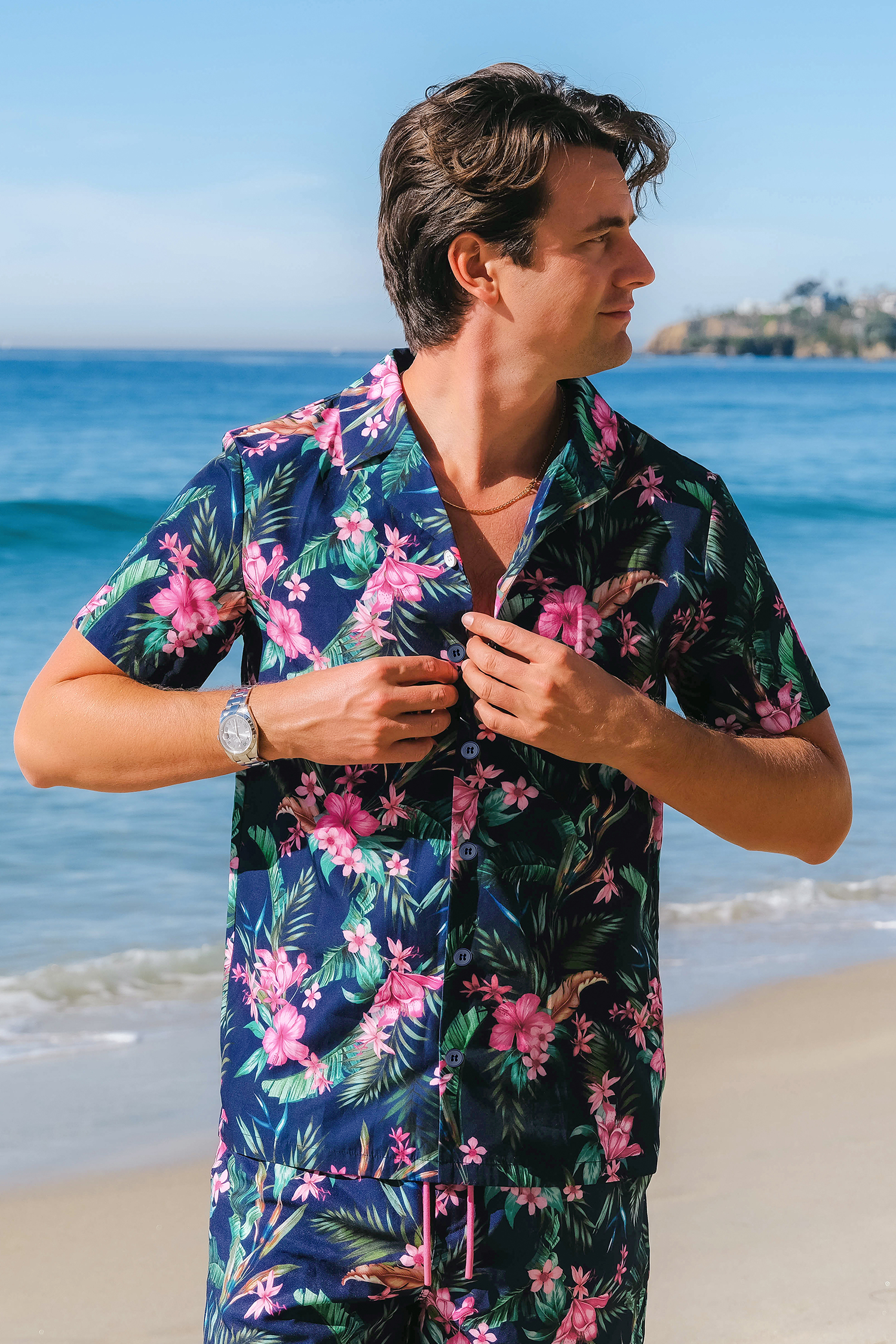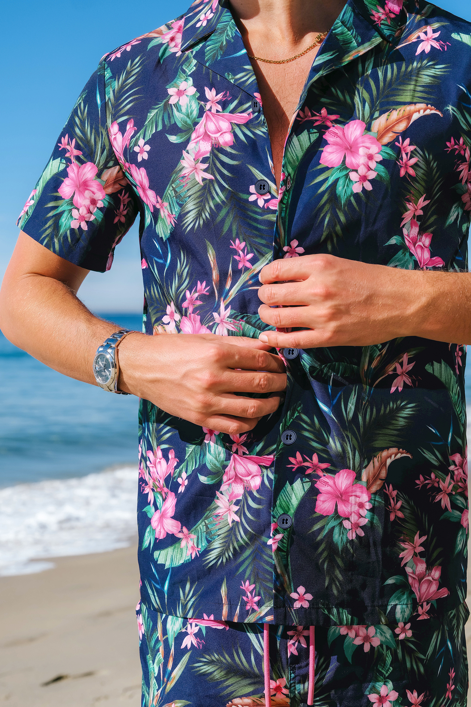 Chemise avec boutons à imprimé floral hawaïen bleu marine pour homme