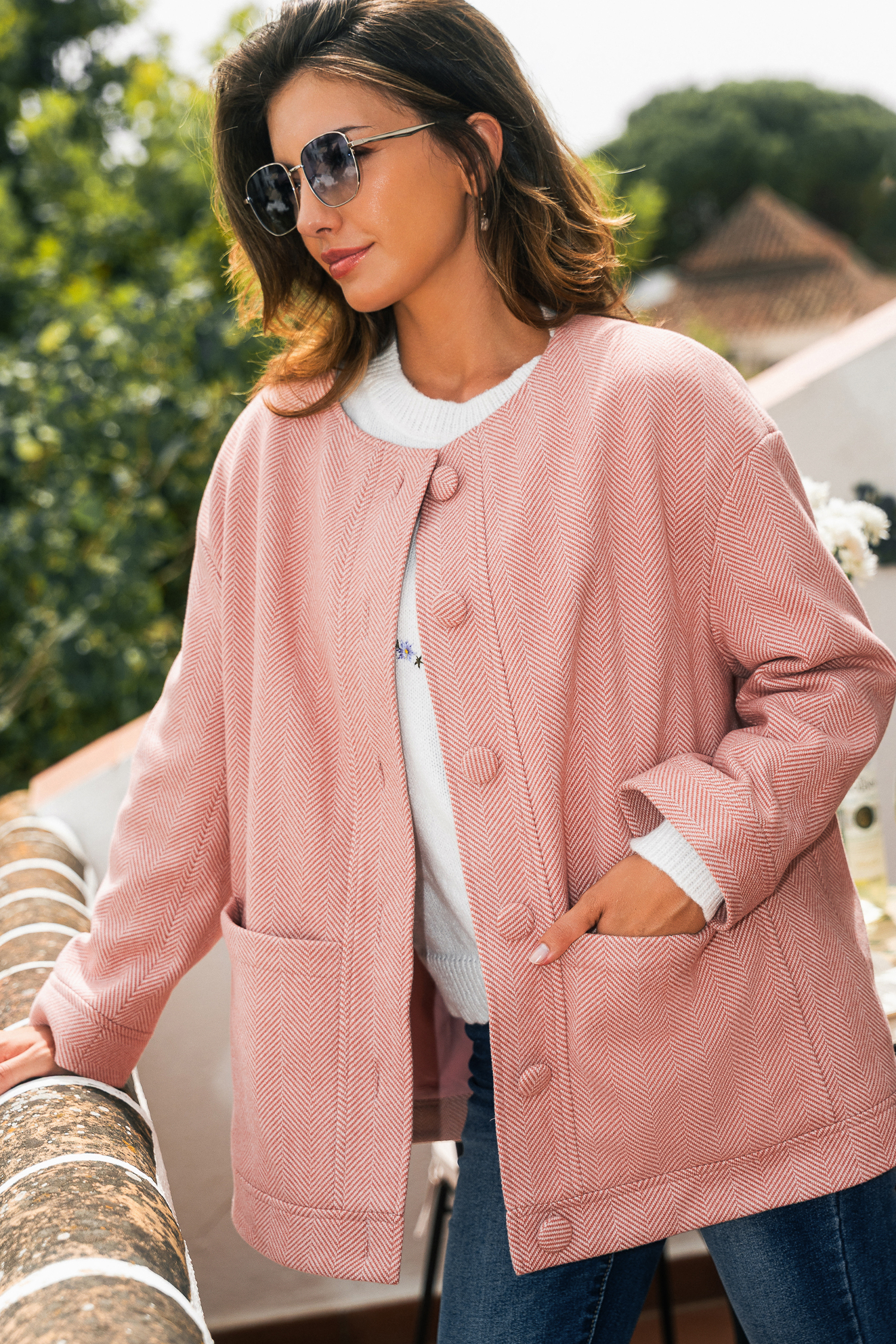 Une veste rose chic et élégante ! Son encolure ronde, ses manches longues et sa fermeture boutonnée lui donnent une allure soignée, parfaite à porter de façon habillée ou décontractée.