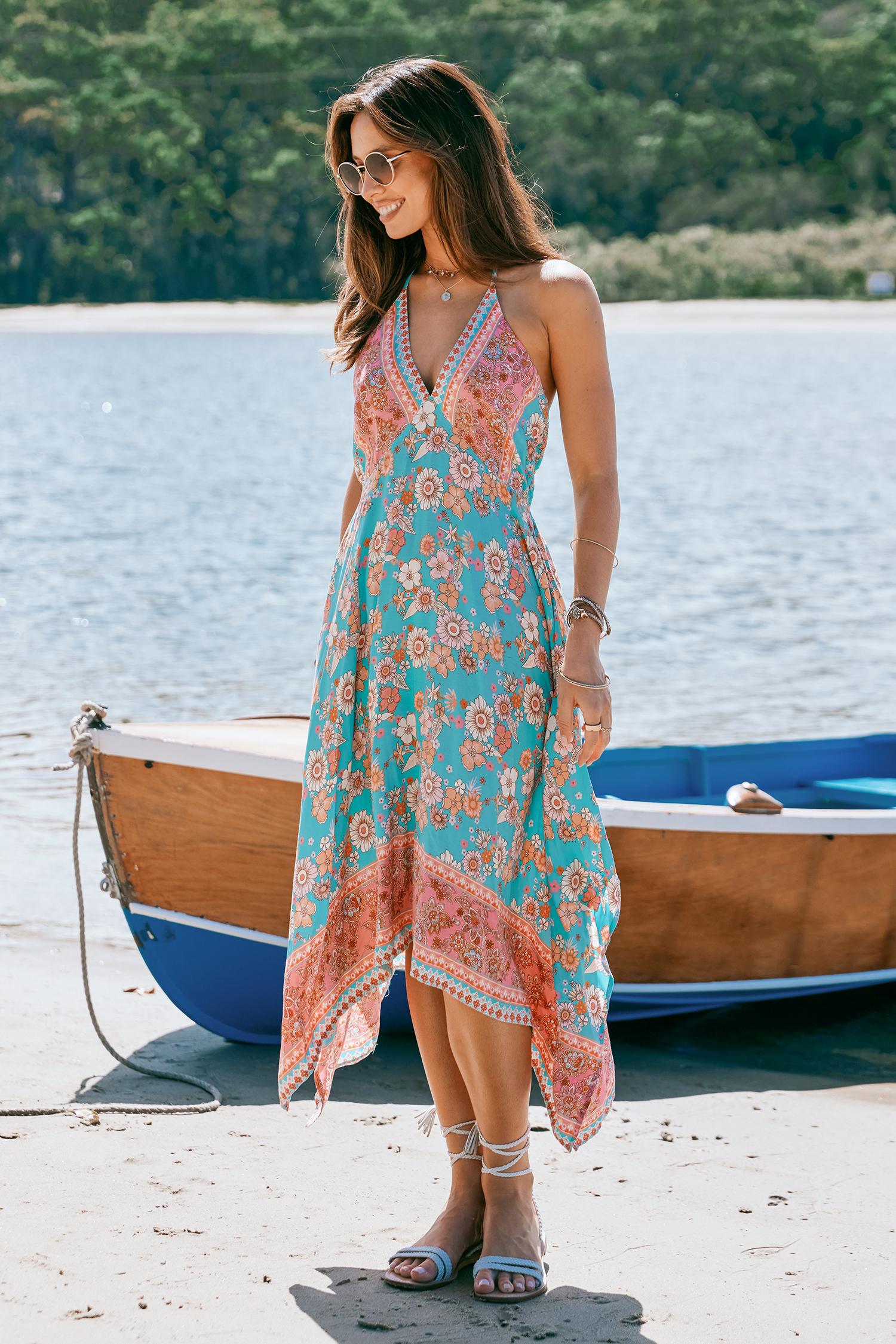 Robe midi asymétrique verte à fleurs roses