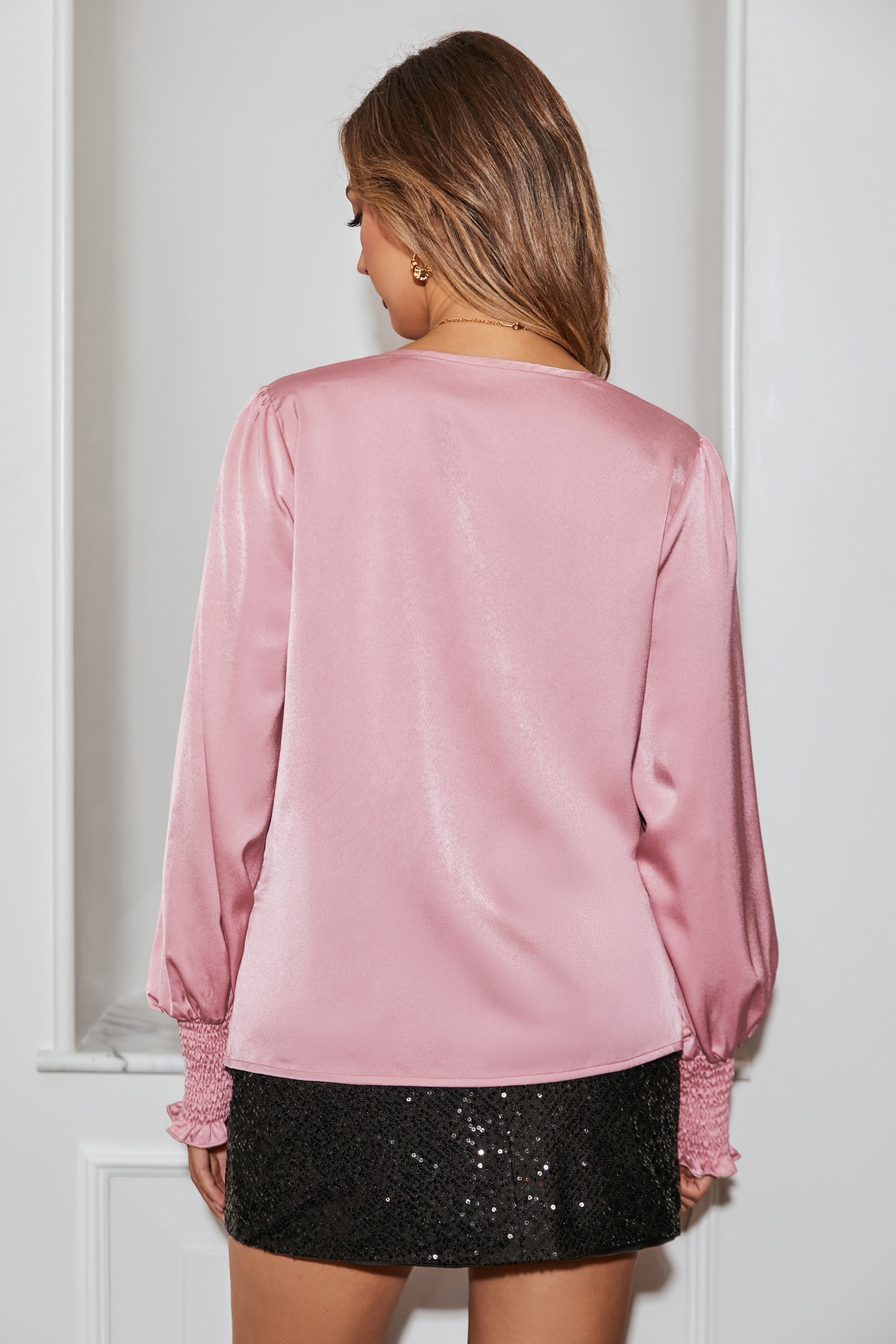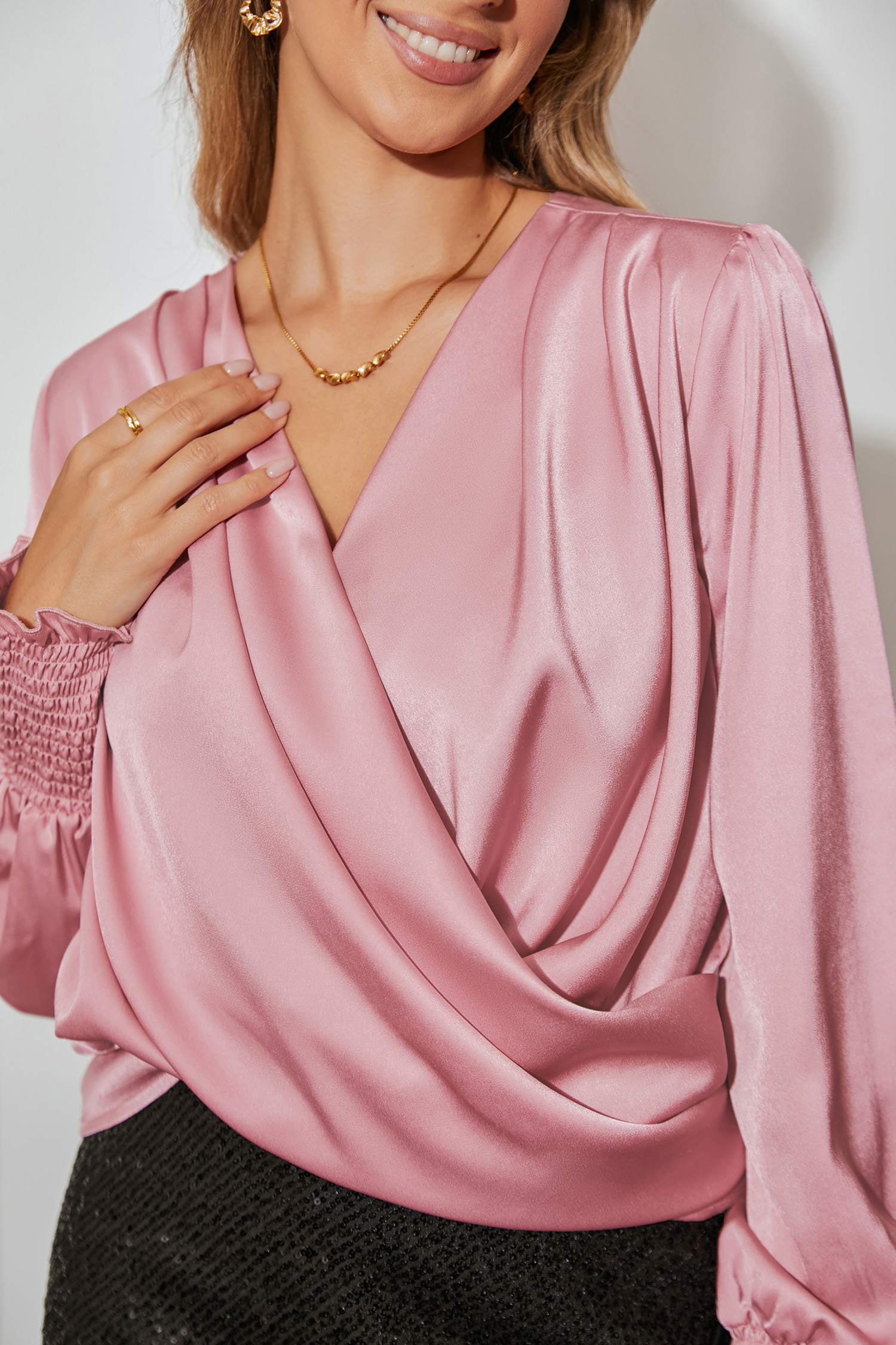 Chemise rose à manches longues avec col drapé et surplis