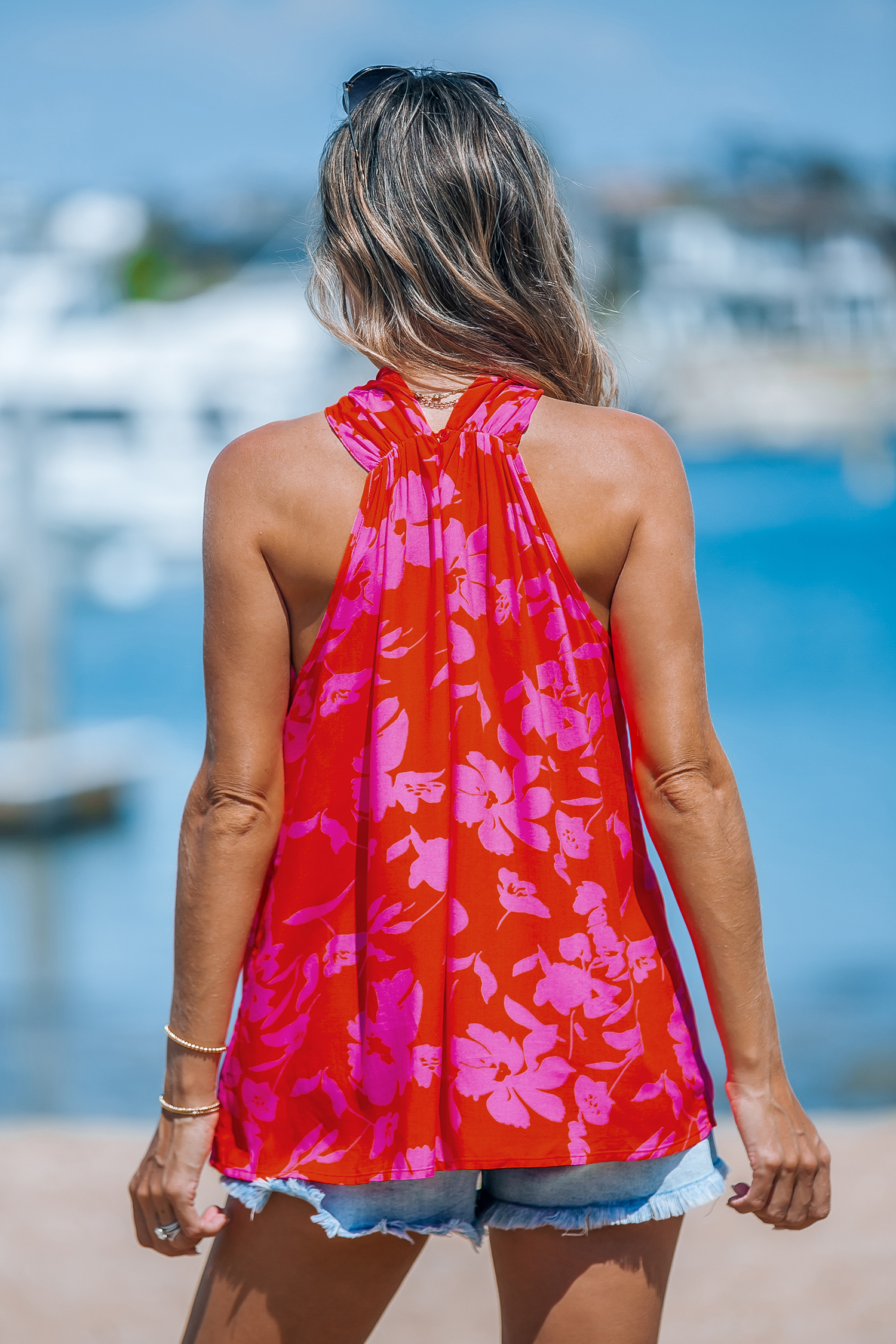 Débardeur à col licou torsadé à fleurs roses