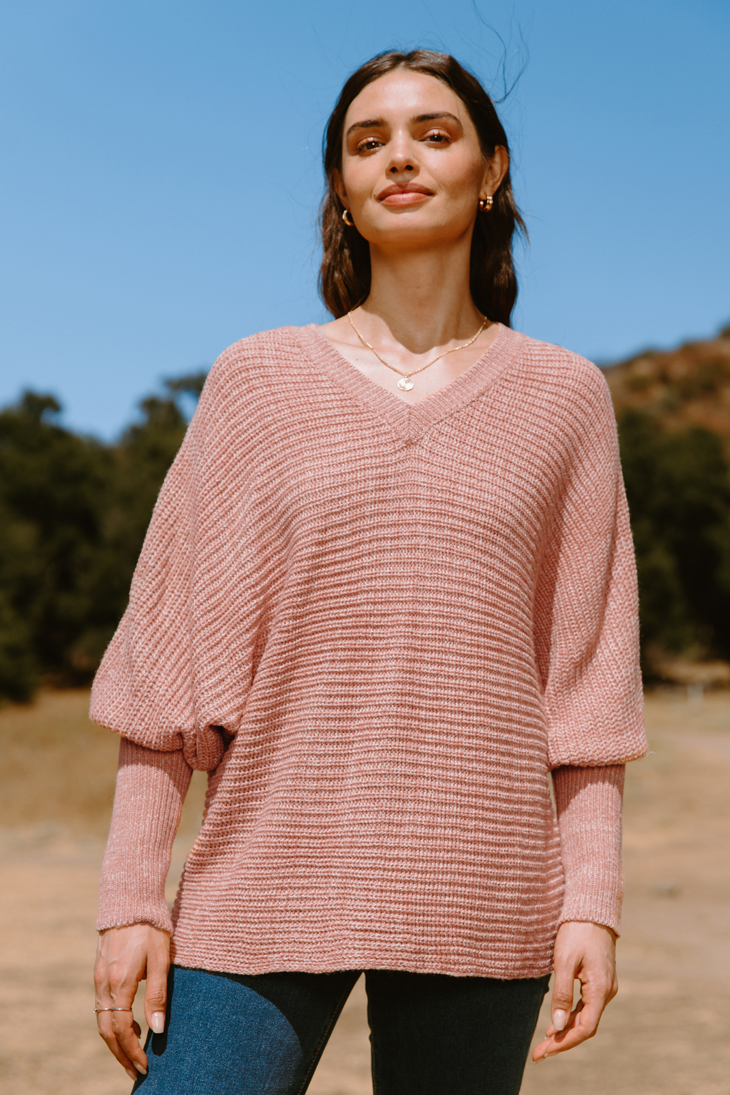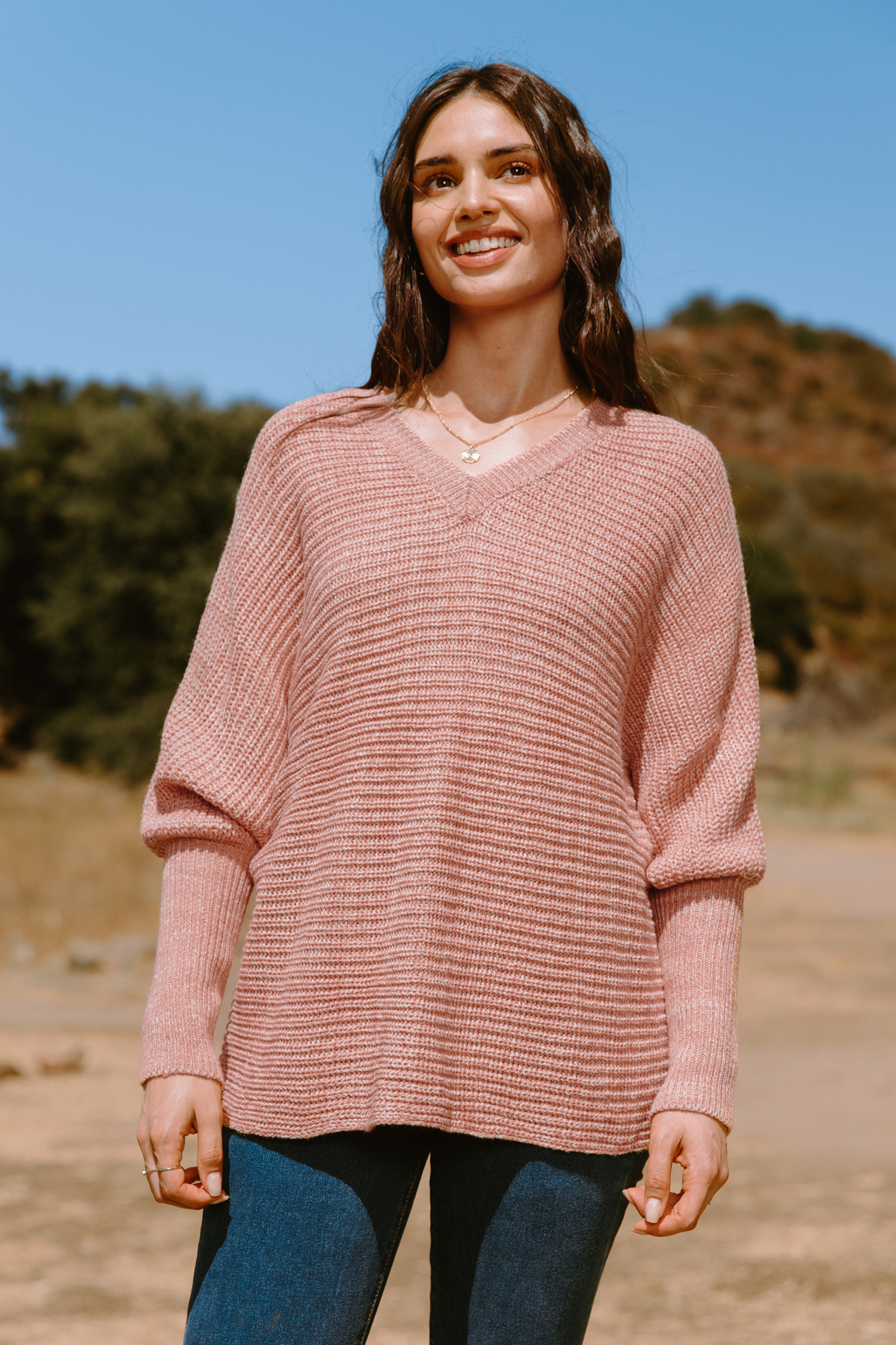 Pull à manches larges et col en V rose