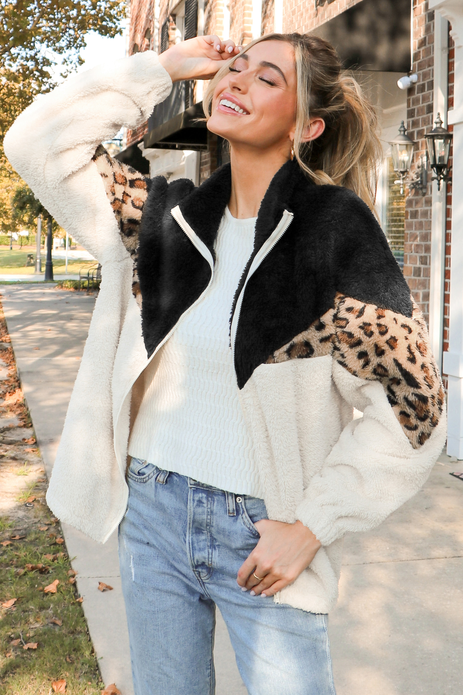 Pull teddy zippé à imprimé léopard et bloc de couleurs