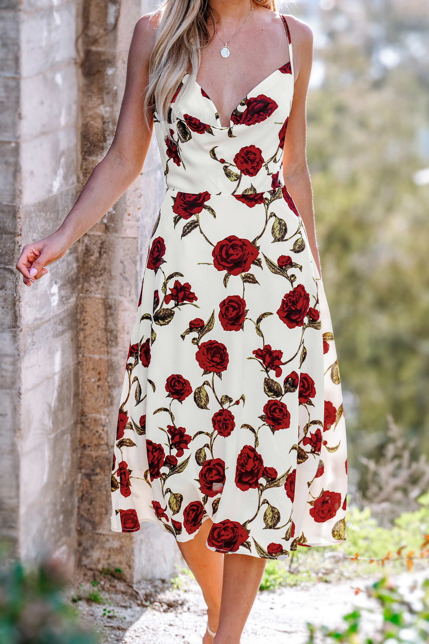 Robe midi sans manches à col bénitier avec roses rouges