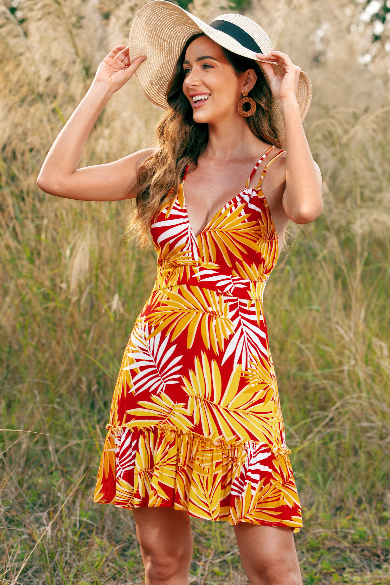 Robe trapèze à bretelles fines et à imprimé plantes tropicales