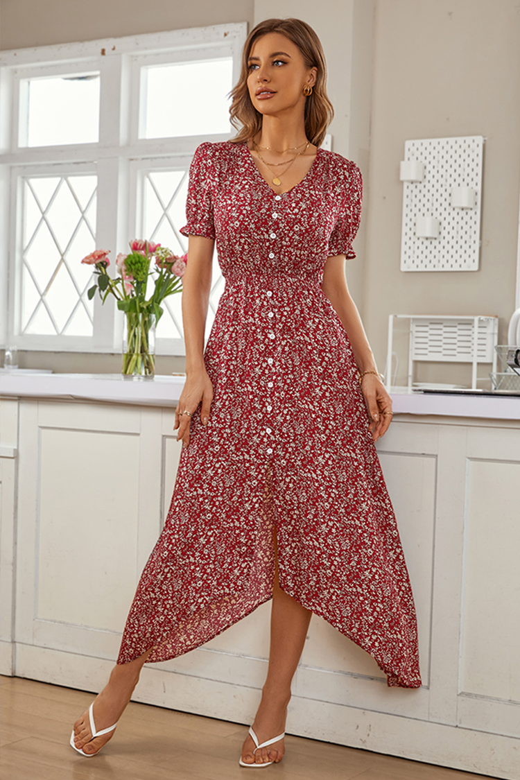 Robe trapèze à smocks à manches bouffantes et col en V