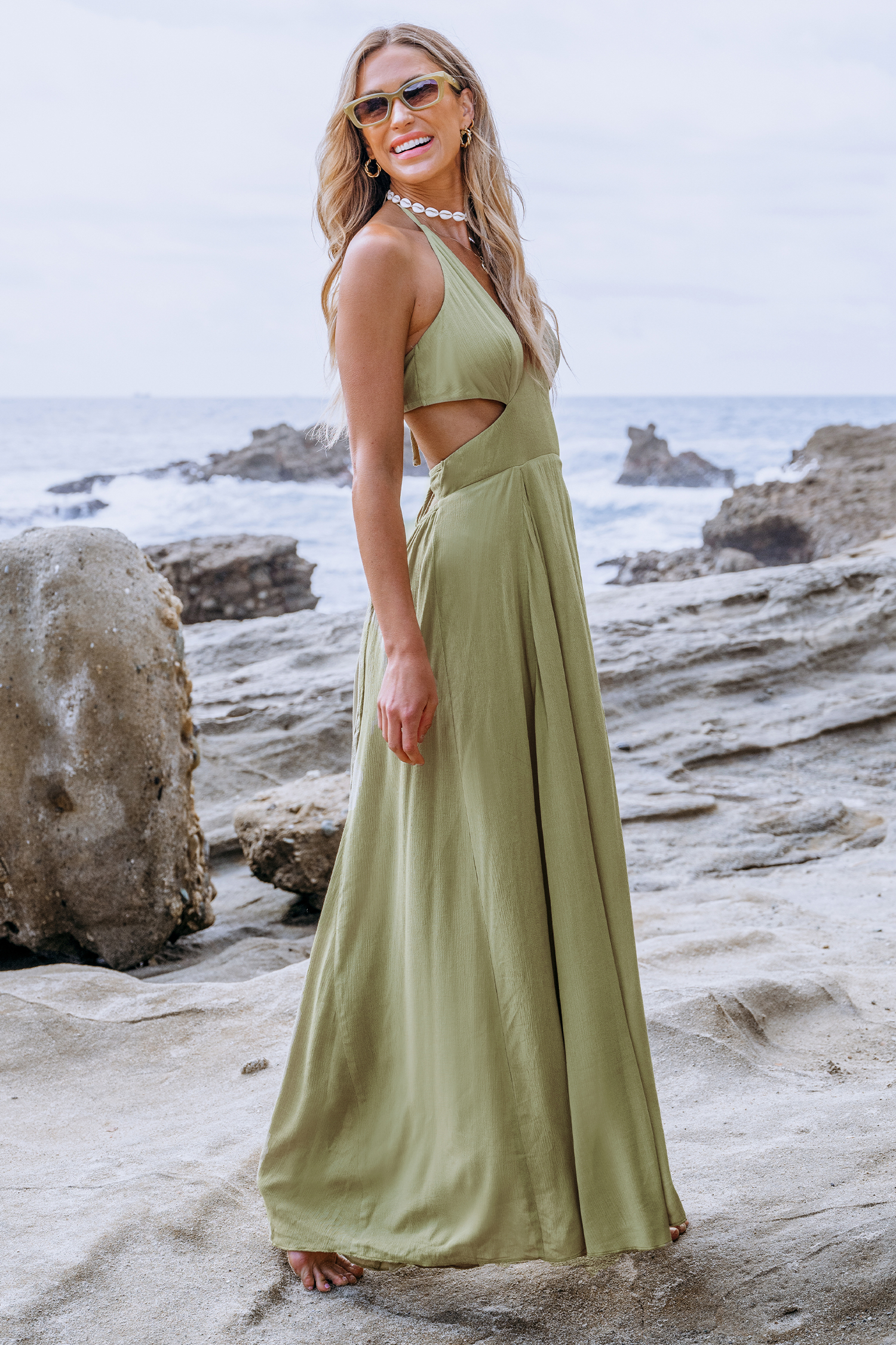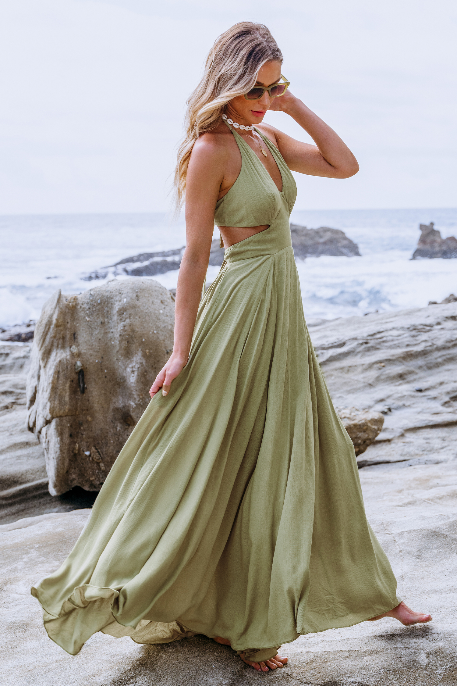 Robe maxi avec col licou plongeant découpée verte