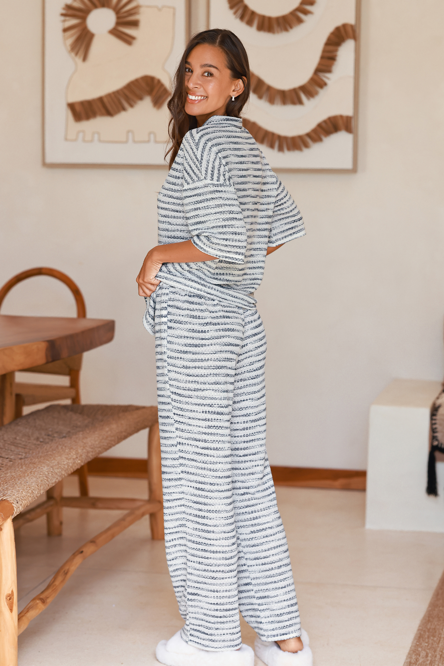 Le set de pyjama rayé est ce dont vous avez besoin pour une soirée décontractée et confortable ! Le col classique et les manches courtes le rendent sans effort chic, tandis que le pantalon assorti complète la vibe confortable et décontractée.