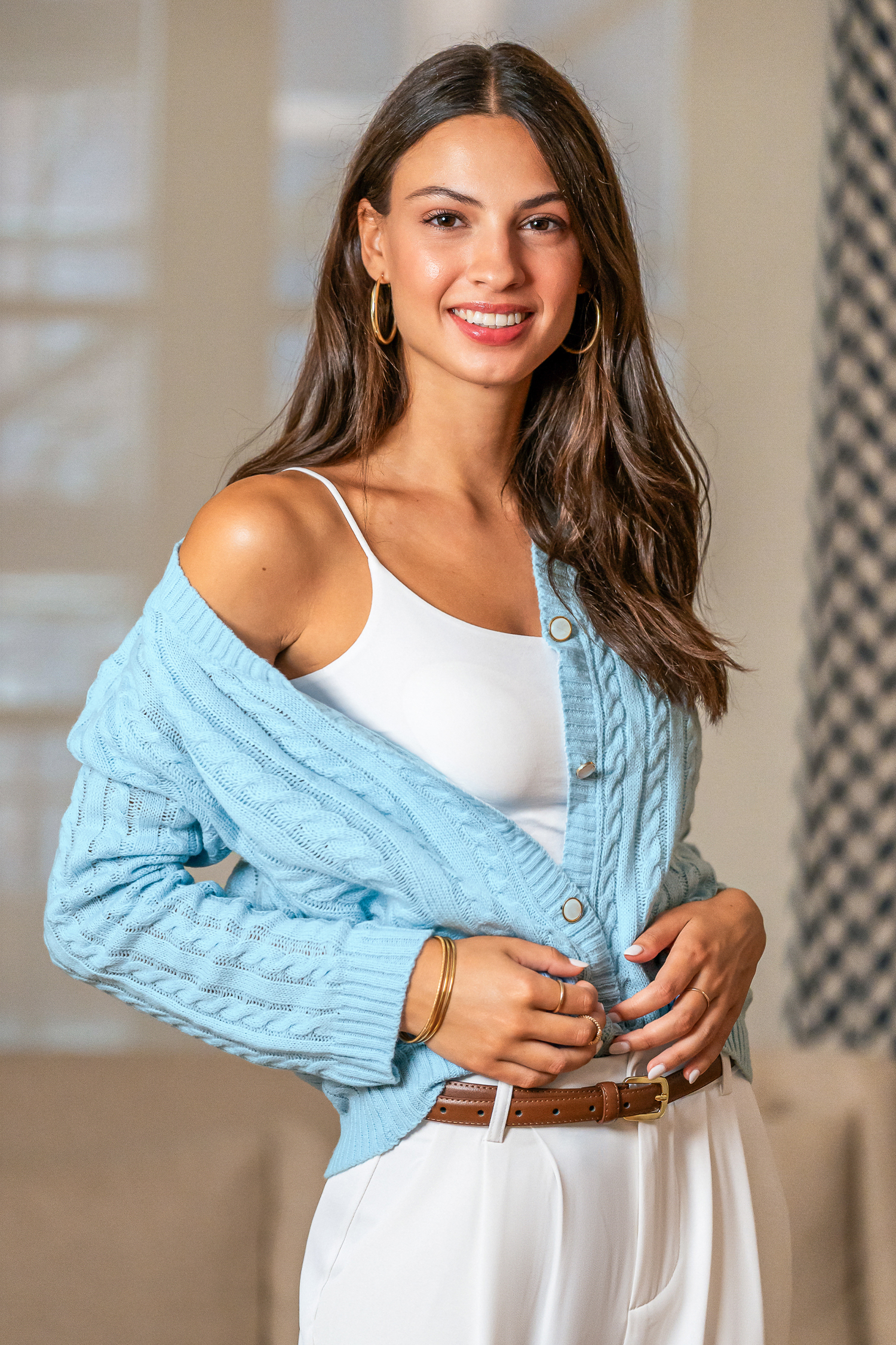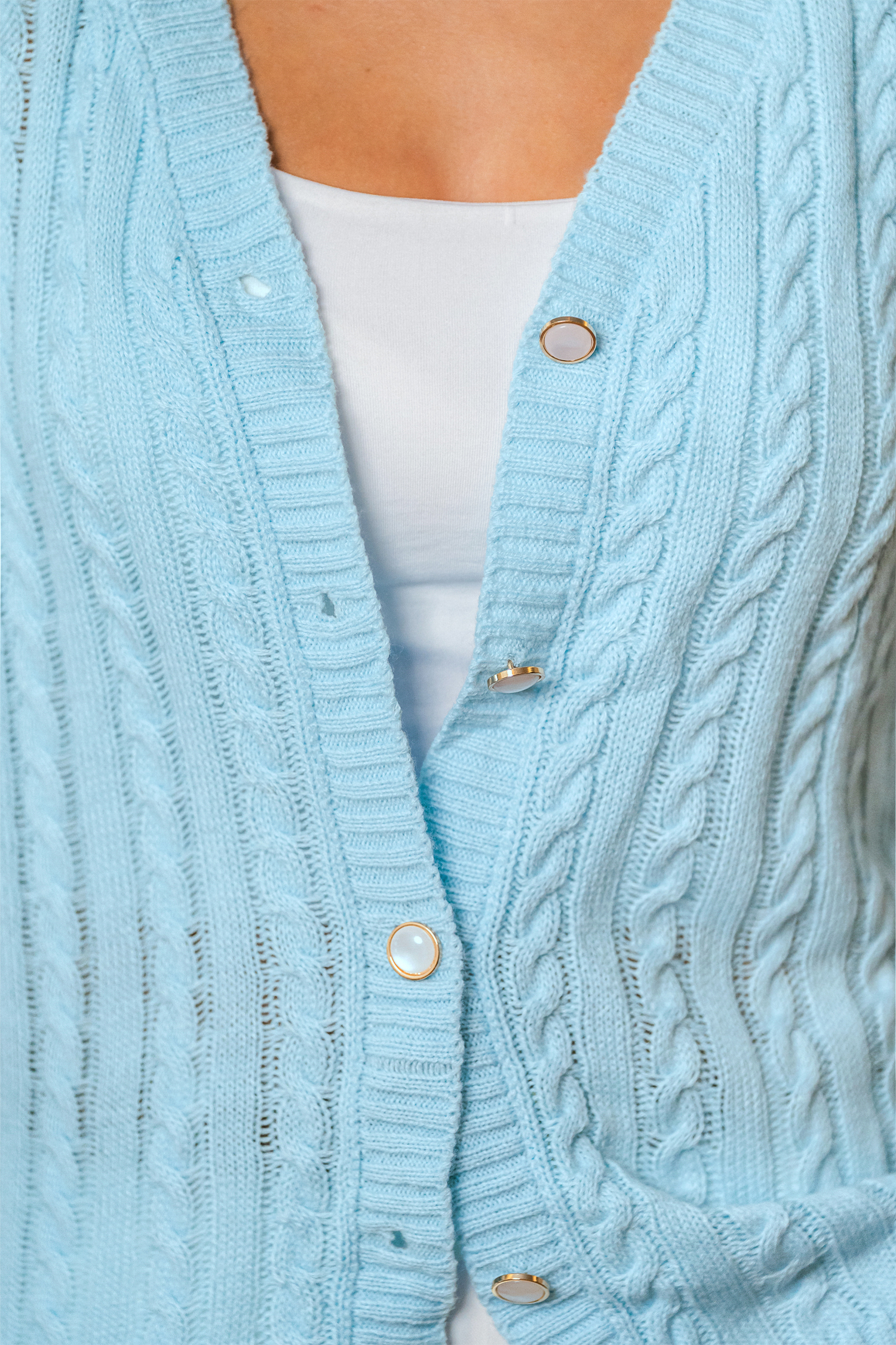 Ce cardigan bleu est un basique idéal pour les journées douces. Encolure en V flatteuse, manches longues et fermeture boutonnée pour une couche légère et chaleureuse.