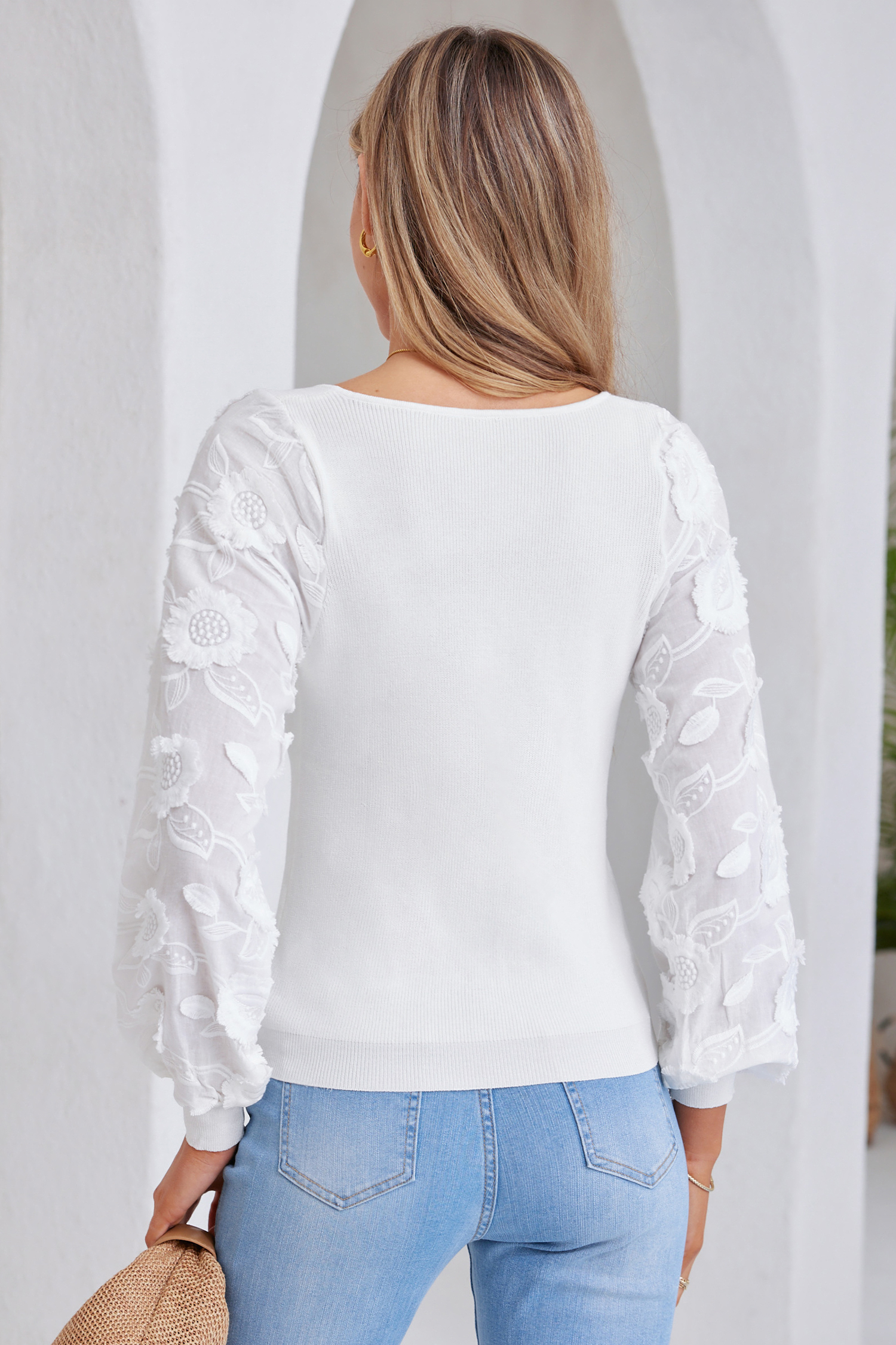 Haut à col diamant et manches bouffantes avec fleurs blanc