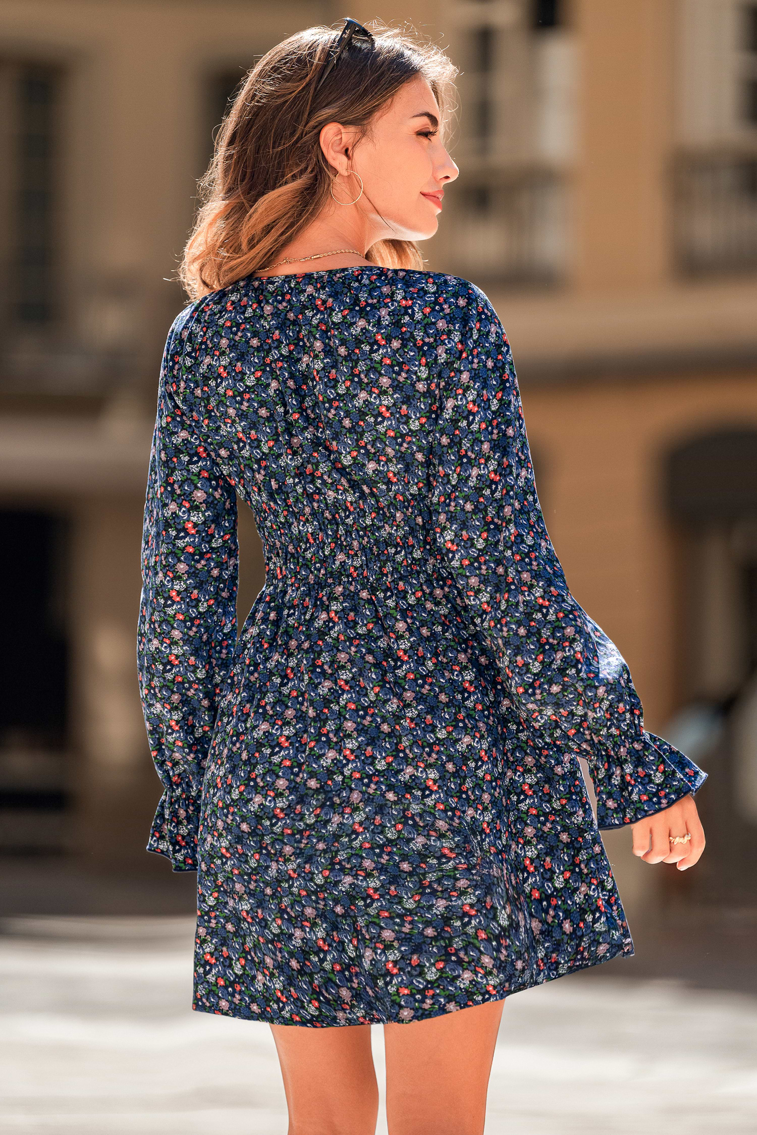 Cette robe mini à fleurs est idéale pour une ambiance romantique sous le ciel étoilé. Son encolure carrée et son lien à nouer à l’avant ajoutent une touche délicate, tandis que le corsage smocké et les poignets volantés créent une finition féminine et rêveuse.